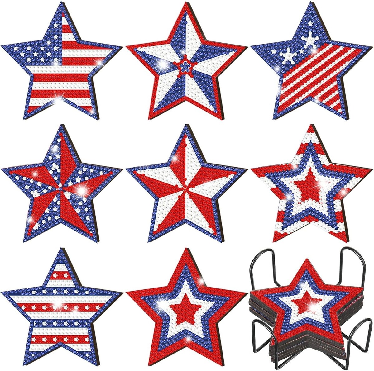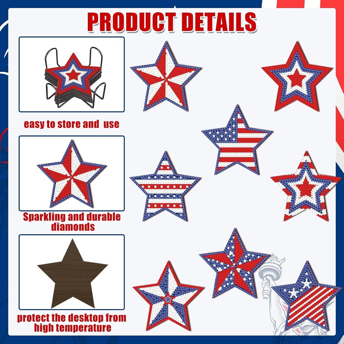 8 pieces of diamond art coasters with 1 coordinating coaster holder, featuring diverse Independence Day patterns.