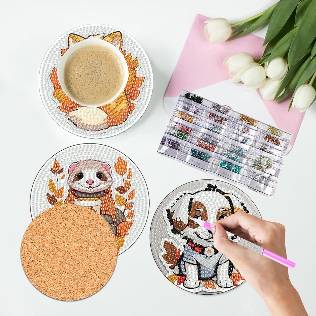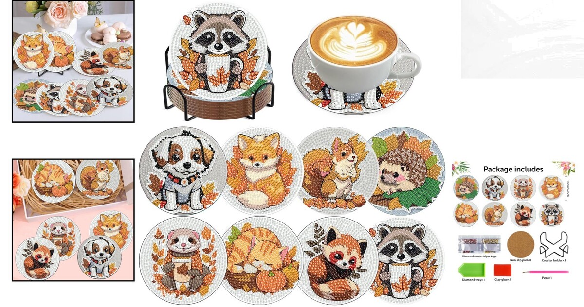 8 Diamond painting coasters featuring delightful Fall Animals themes.