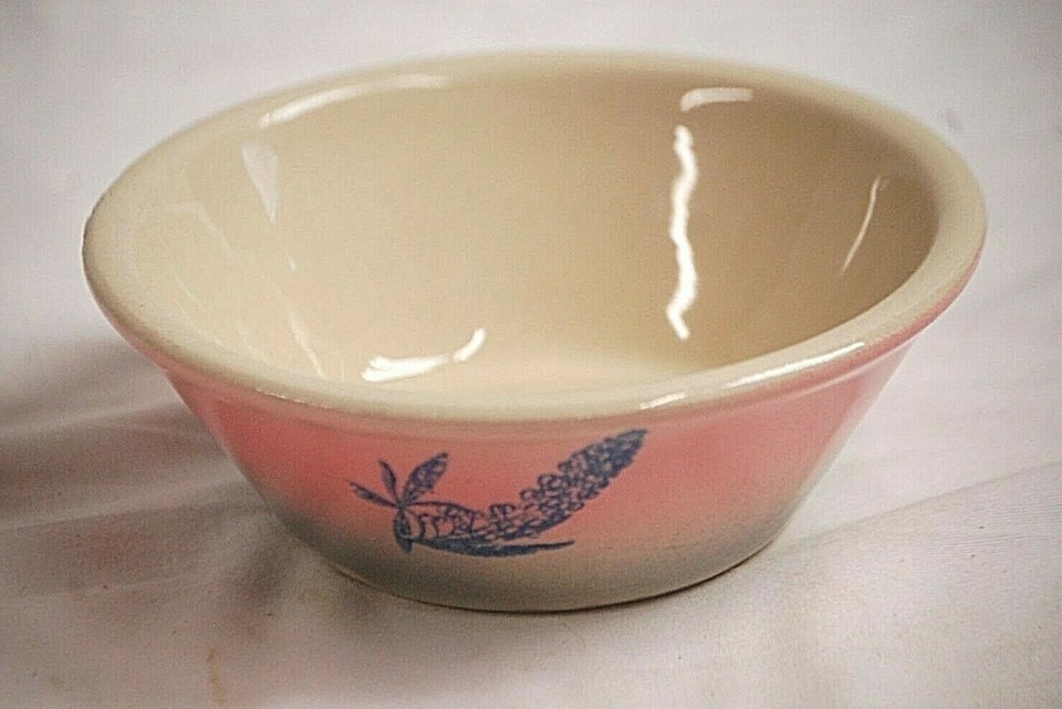 Stoneware Pink & Gray Mixing Bowl Blue Flower Stamp Vintage MCM 6-1/4"