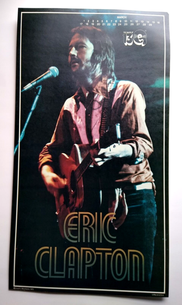 Great shot of one of rocks guitar legends Eric Clapton. Vintage 22" x 12.25" licensed wall poster. These were the first glossy licensed paper posters ever produced featuring rock stars. Dream Merchants issued a different one each month for a year. Now, they are nearly impossible to find. Issued in November, 1975. Super nice UNUSED condition with light age wear.