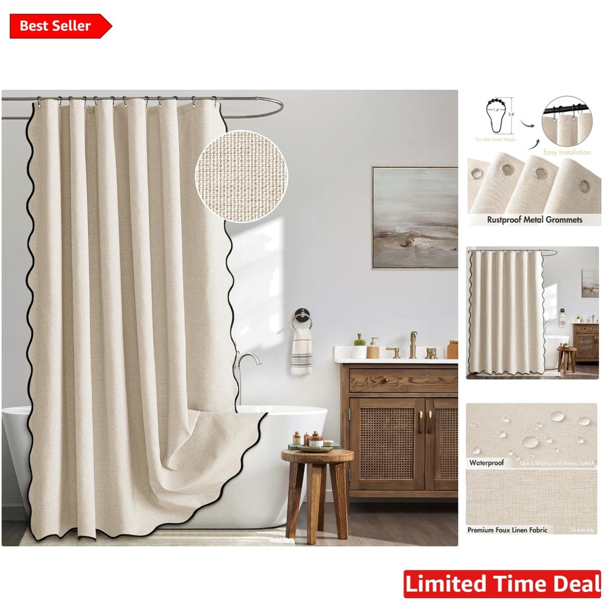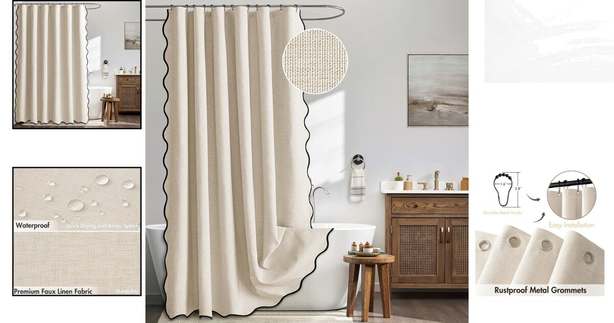 84'' Scalloped Edge Shower Curtain with Grommets - Washable Cream Beige Design
