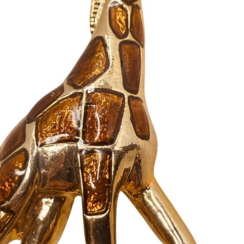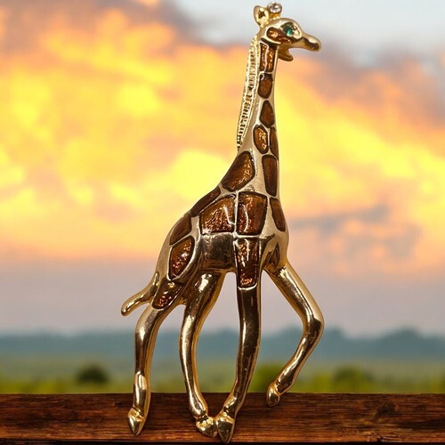 This vintage brooch features a giraffe shape adorned with green rhinestone eyes, set in a gold-tone enamel material. The piece is signed as an original design and is a fashion jewelry item in the theme of animals and insects. Perfect for Christmas, anniversary, or birthday gifting, this unique giraffe pin adds a touch of whimsy and elegance to any outfit.