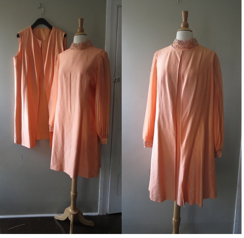 Vtg 1960s Peach beaded cocktail Dress & overcoat Set fits L