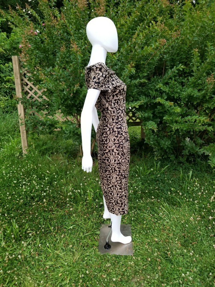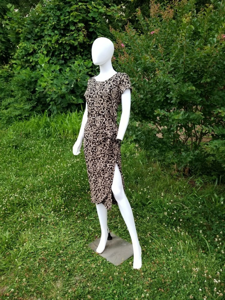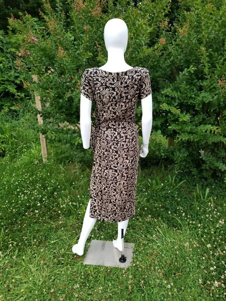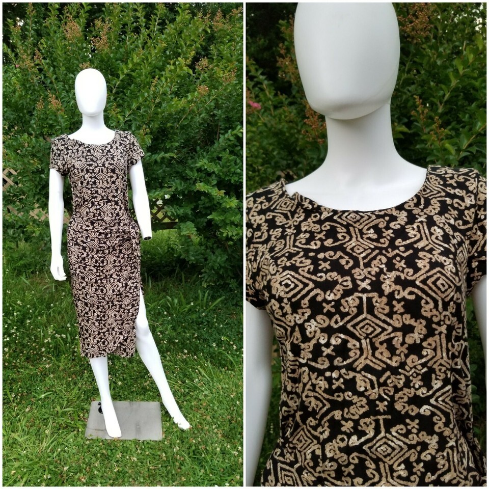 Vintage 90s Jessica Howard Rayon Tribal Print Midi Fitted wiggle Dress W26-27"