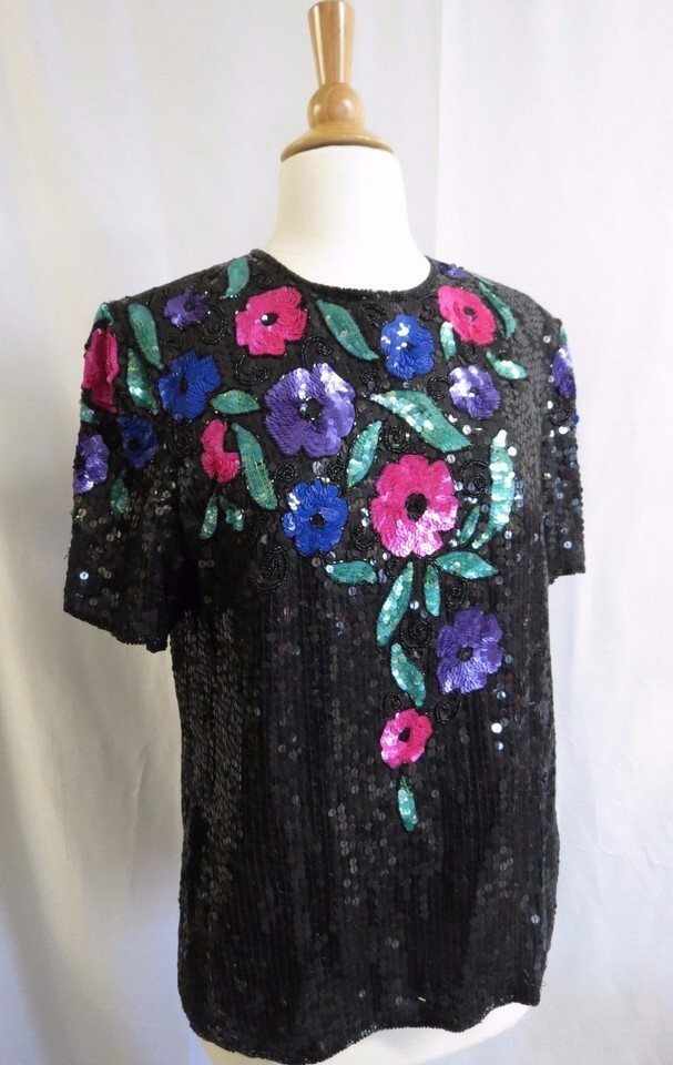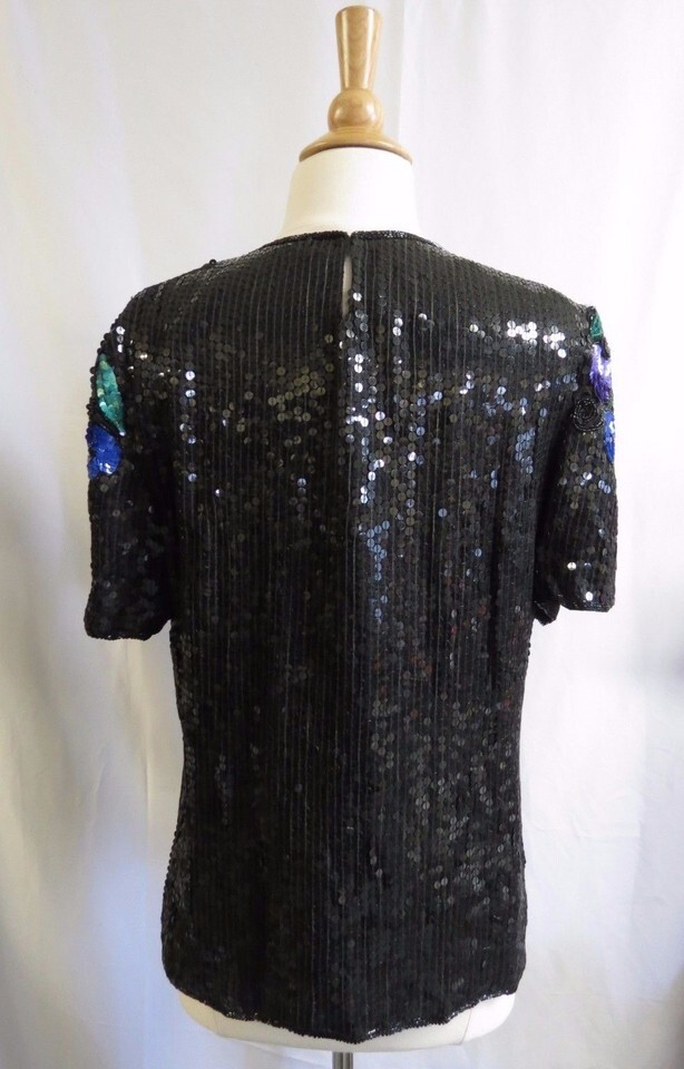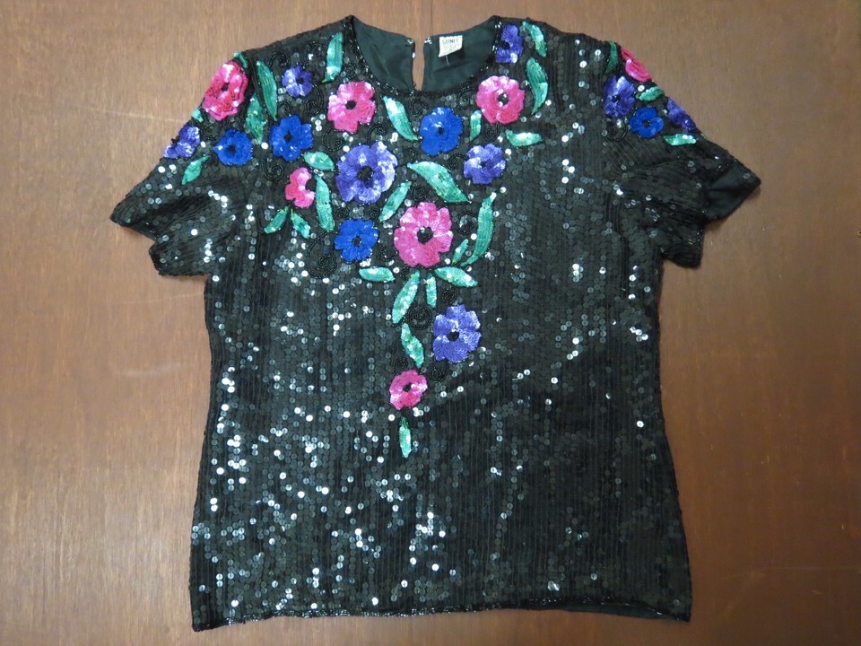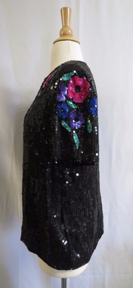 Vintage Gunit Black Silk Sequin beaded Short Sleeve Top color Flowers dressy M