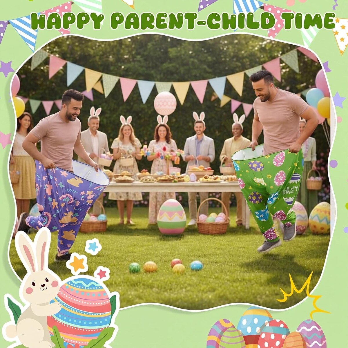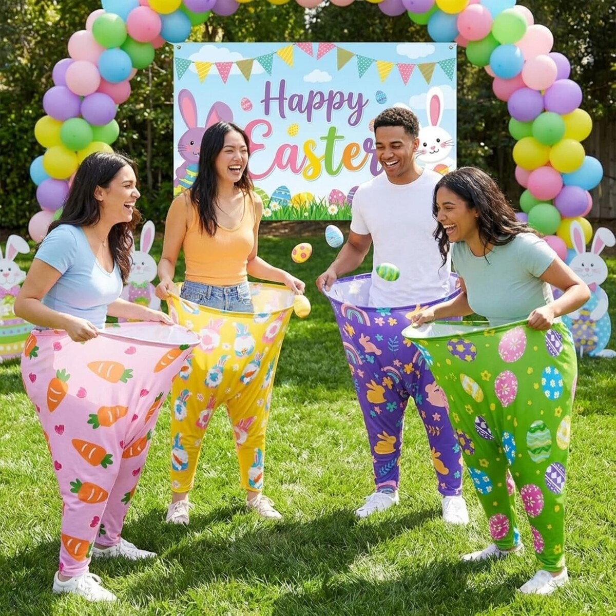 4 oversized pants designed for easy tossing and active play, featuring eye-catching Easter-themed patterns.