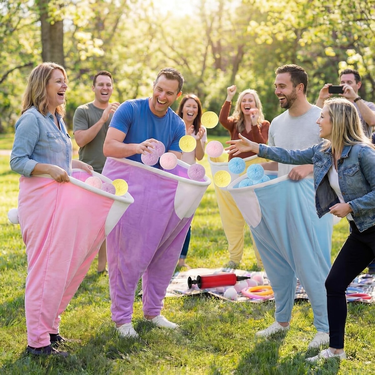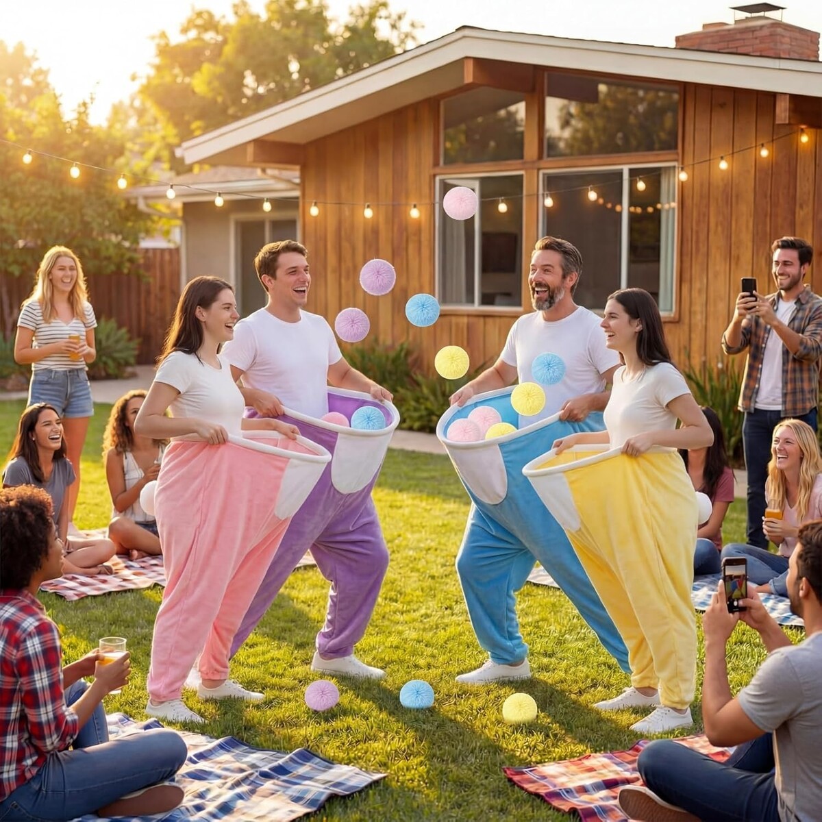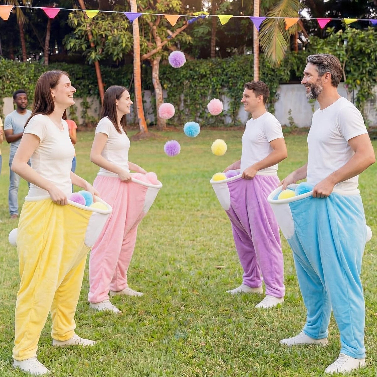 Wear the giant stretchy granny pants and catch the soft pom-pom balls tossed by friends, promoting laughter and interaction.