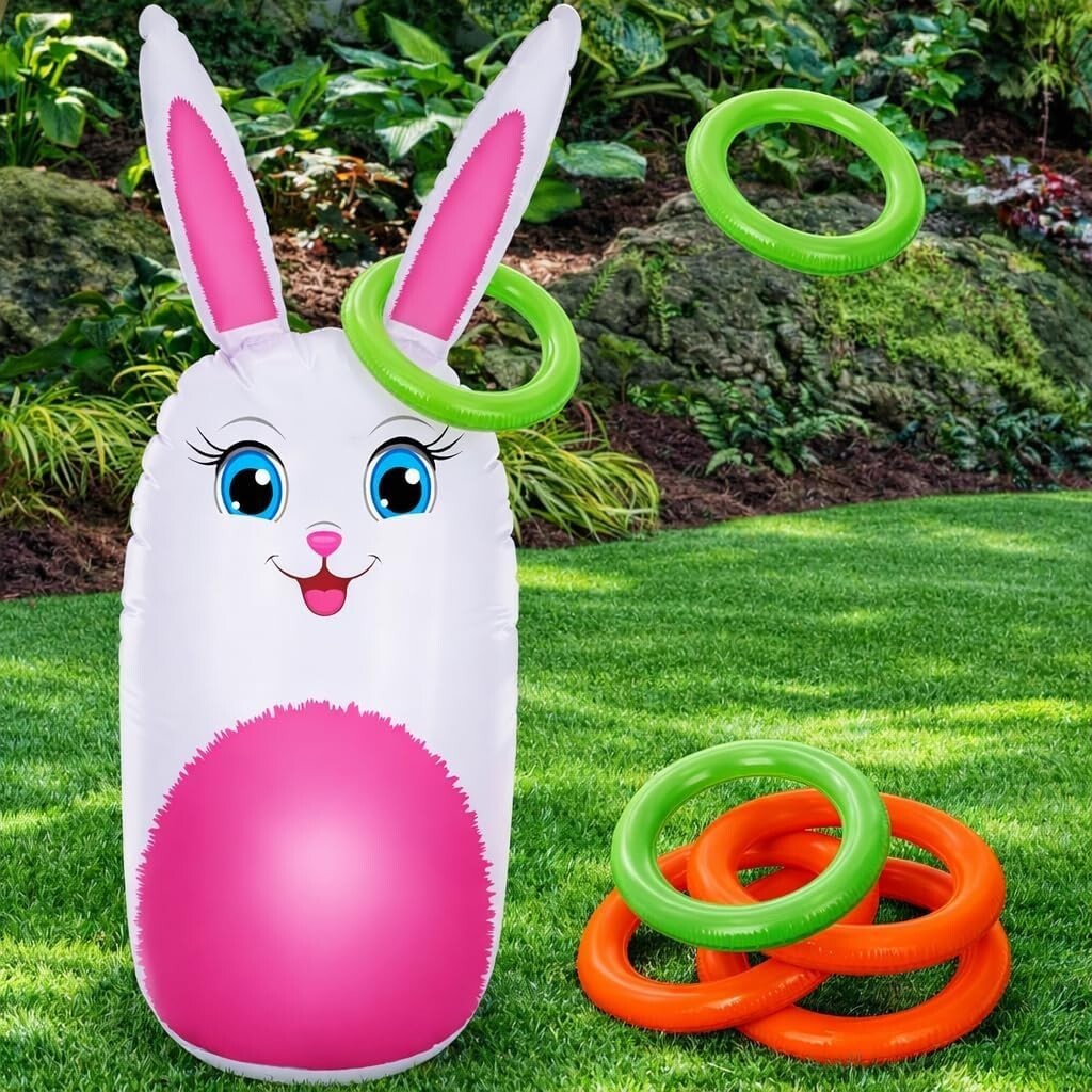 34-Inch Inflatable Bunny Ring Toss Game with 6 Colorful Rings for Easter Fun