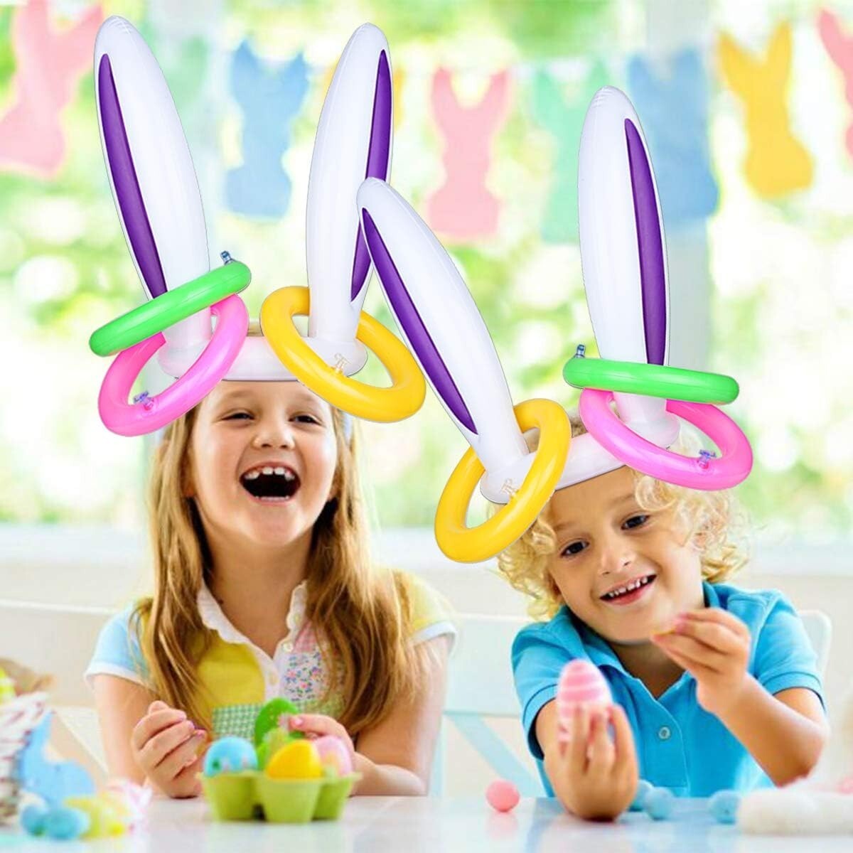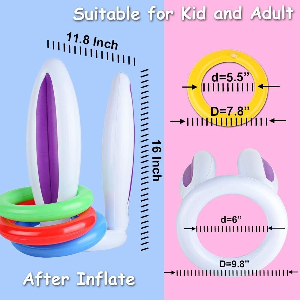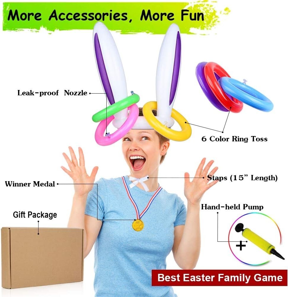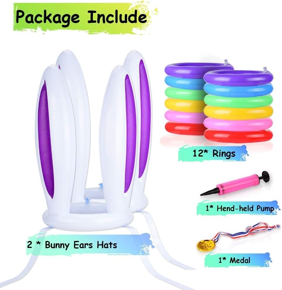 2 Sets in 1 Package: Includes 2 Bunny Ears Hats, 12 Inflatable Rings in 6 vibrant colors, 1 Hand-held pump, and a Gold Medal. Perfect for 2-8 players!