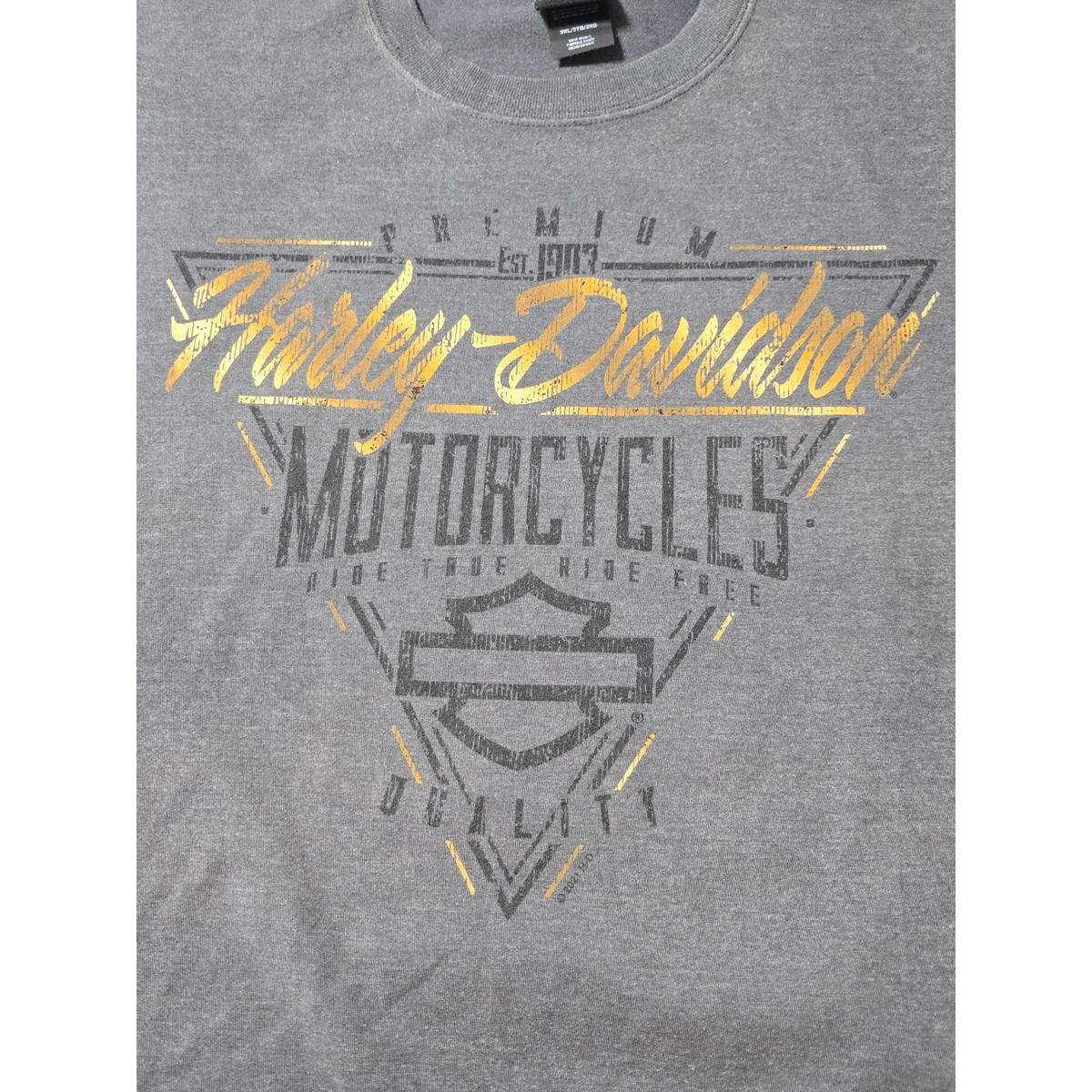 Harley-Davidson short sleeve graphic t-shirt features a bold gold and black "Premium Motorcycles" design on the front and a vibrant "Rockstar Harley-Davidson Ft. Myers, Florida" alligator graphic on the back. The dark heather gray fabric is a comfortable cotton blend with a classic crew neck and short sleeves. This double-sided tee showcases iconic biker style with a Florida-inspired twist, perfect for enthusiasts and collectors alike.