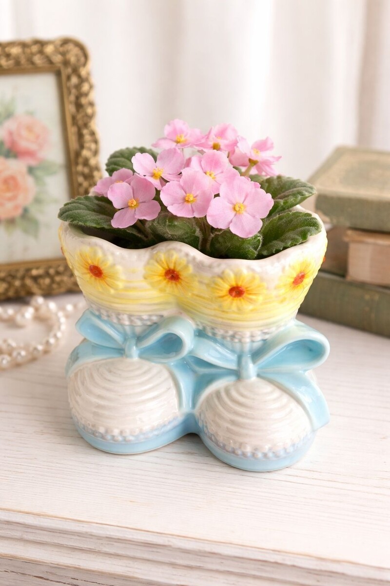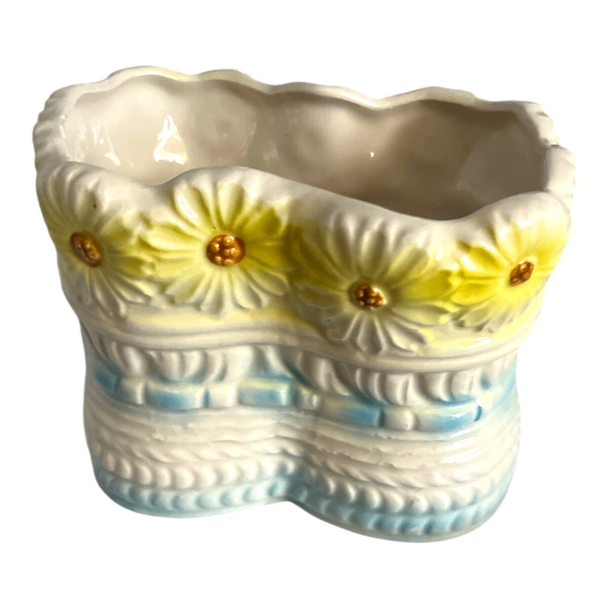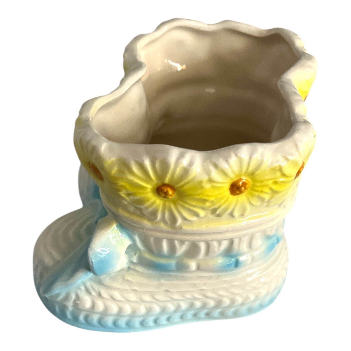 Charming vintage ceramic planter featuring a pair of baby booties forming a shared bowl, accented with a ring of yellow daisy flowers around the rim. The base is finished in a soft blue glaze with sculpted bow and shoe details, creating a sweet nursery-style vintage look.
