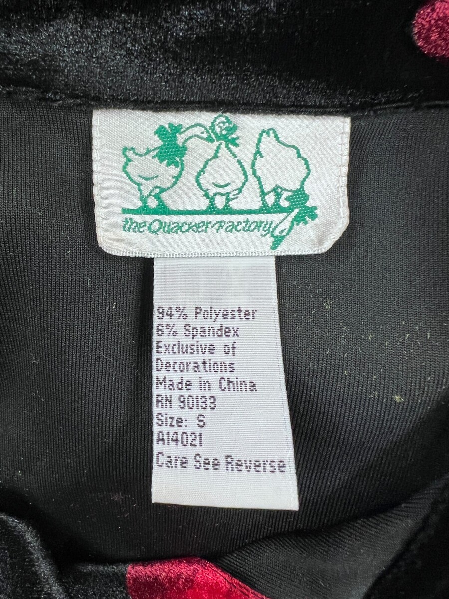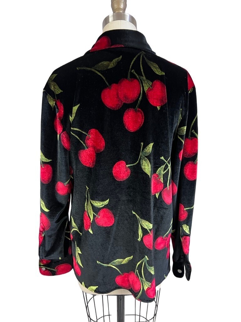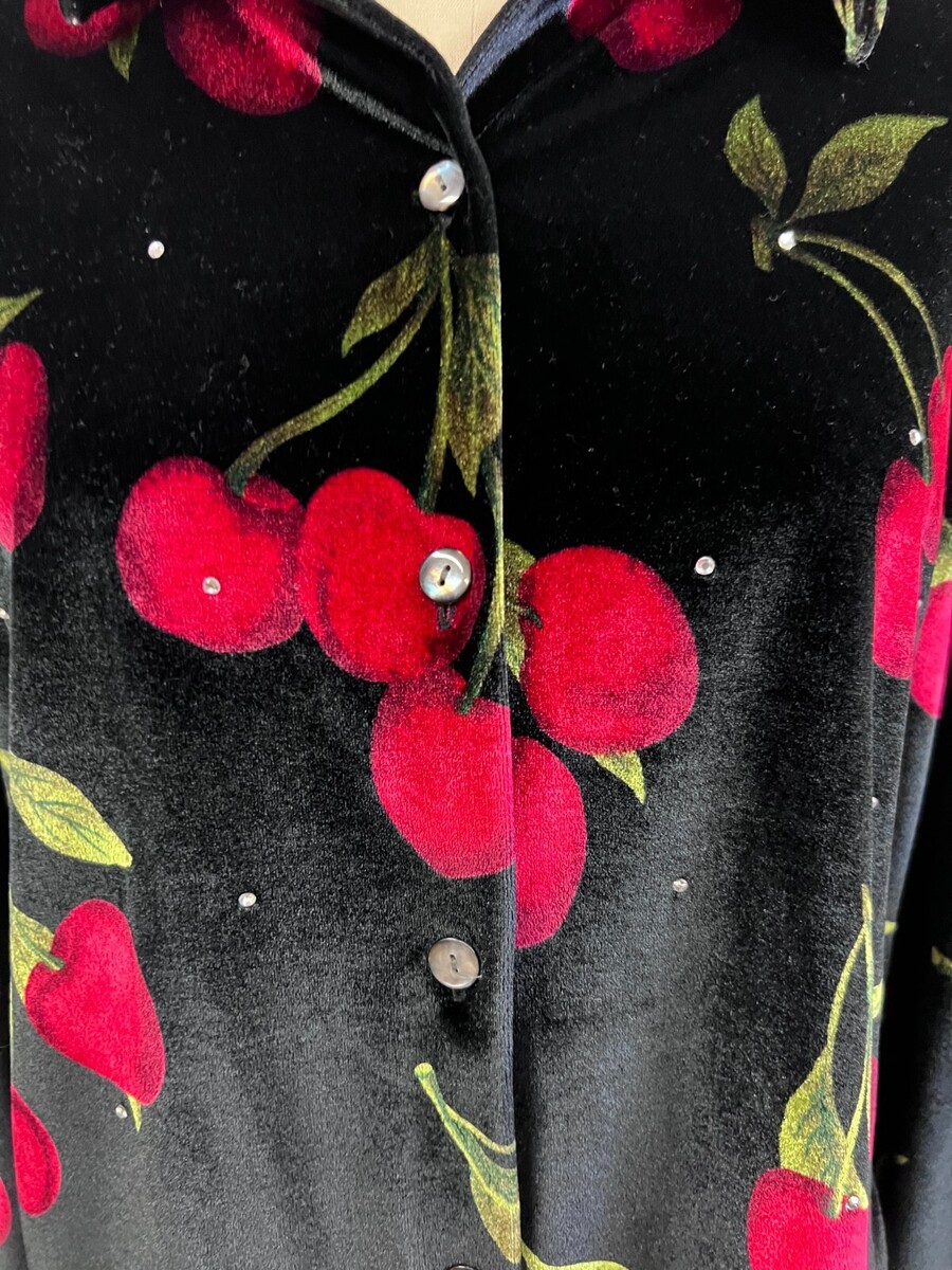 Quacker Factory Cherry Print Velvet Button Up Blouse With Gems Size S EUC