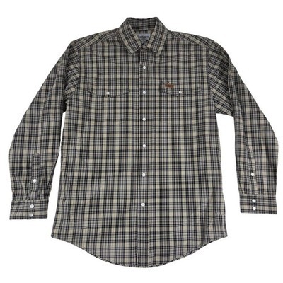 This vintage-inspired Carhartt plaid pearl-snap shirt channels rugged Americana, Western workwear, and classic 90s outdoors style, with its durable 100% cotton weave, double chest pockets, and crisp black-tan-red check pattern.