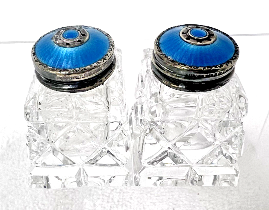 Antique Art Deco Norway Blue Guilloche Enamel Sterling Silver Crystal Shakers. (the color is the lighter blue not cobalt looking) Elegant cut crystal with sterling and Guilloche enamel lid miniature shakers measure approx. 1 3/4" tall, sterling and enamel lids in great condition, no chips or cracks to polished bottom crystal shakers, really nice condition. See pictures.