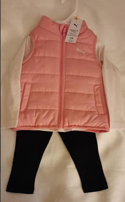 Puma Infant 12 Months 3 Piece Set Pinkscape/Paysage Rose Puffer Vest Sleeveless Jacket Zip up , Longsleeve Shirt Black Leggings.
