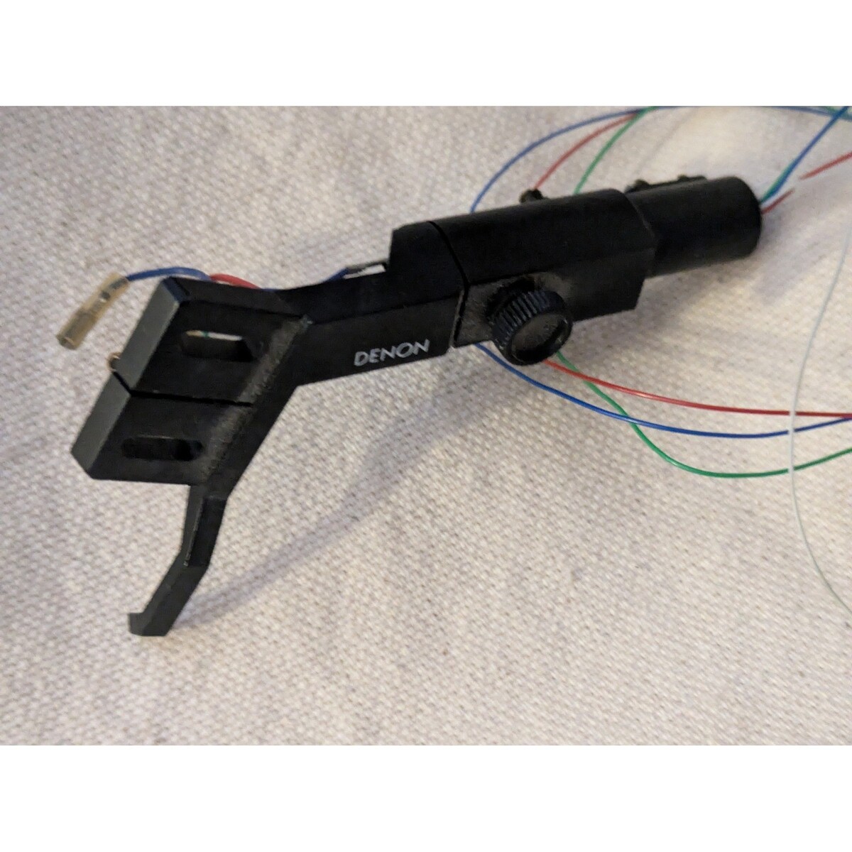 Denon headshell designed for vintage turntables, featuring a sleek black finish and the iconic brand logo. This essential phono component includes integrated lead wires (red, white, blue, and green) with gold-tone connectors for reliable signal transmission. The assembly features a standard mount design with adjustable slots for cartridge alignment and a side-mounted finger lift for precise manual cueing. Ideal for audiophiles looking to restore or upgrade their Denon record player setup.