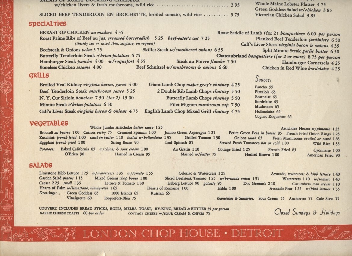 London Chop House Dinner Menu Wine List Detroit Michigan 1960's