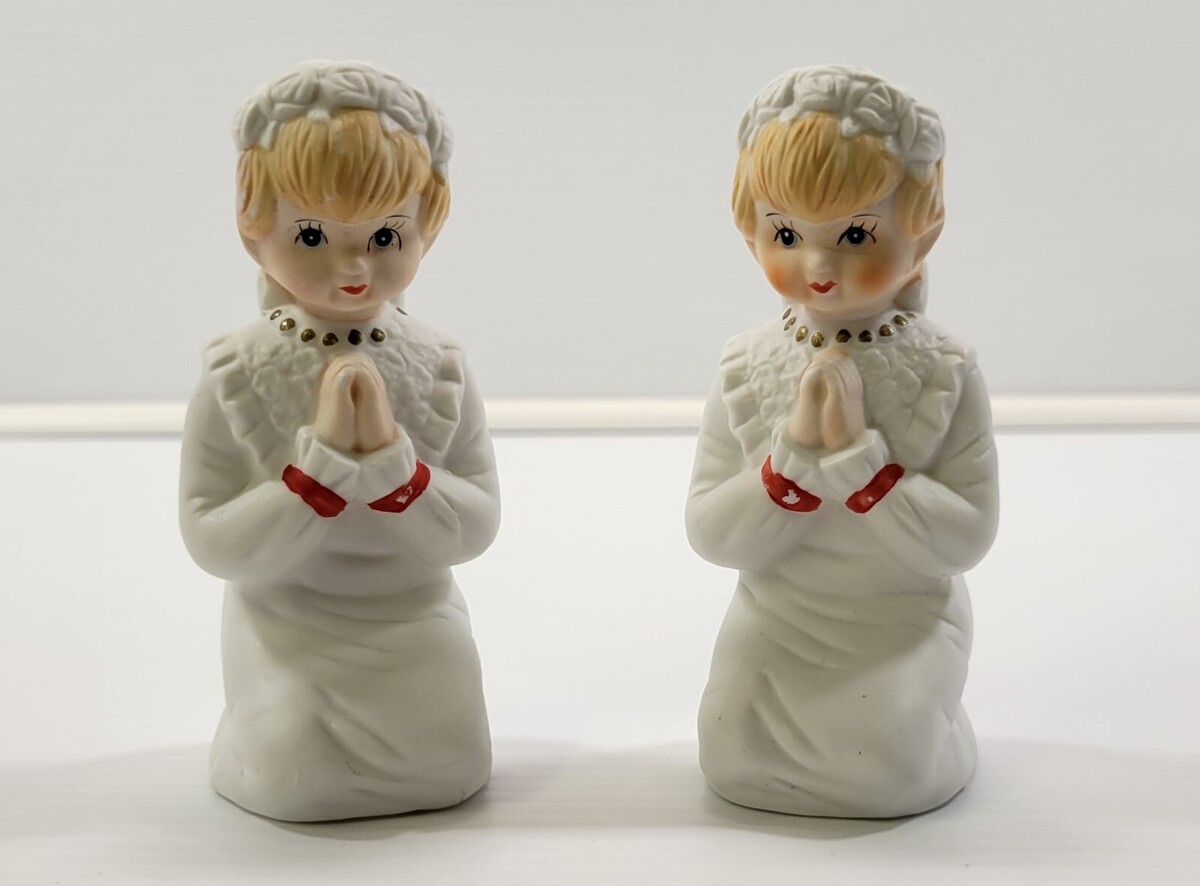 N) Vintage Set of 2 Ceramic Kneeling Praying Girl Figurines Communion