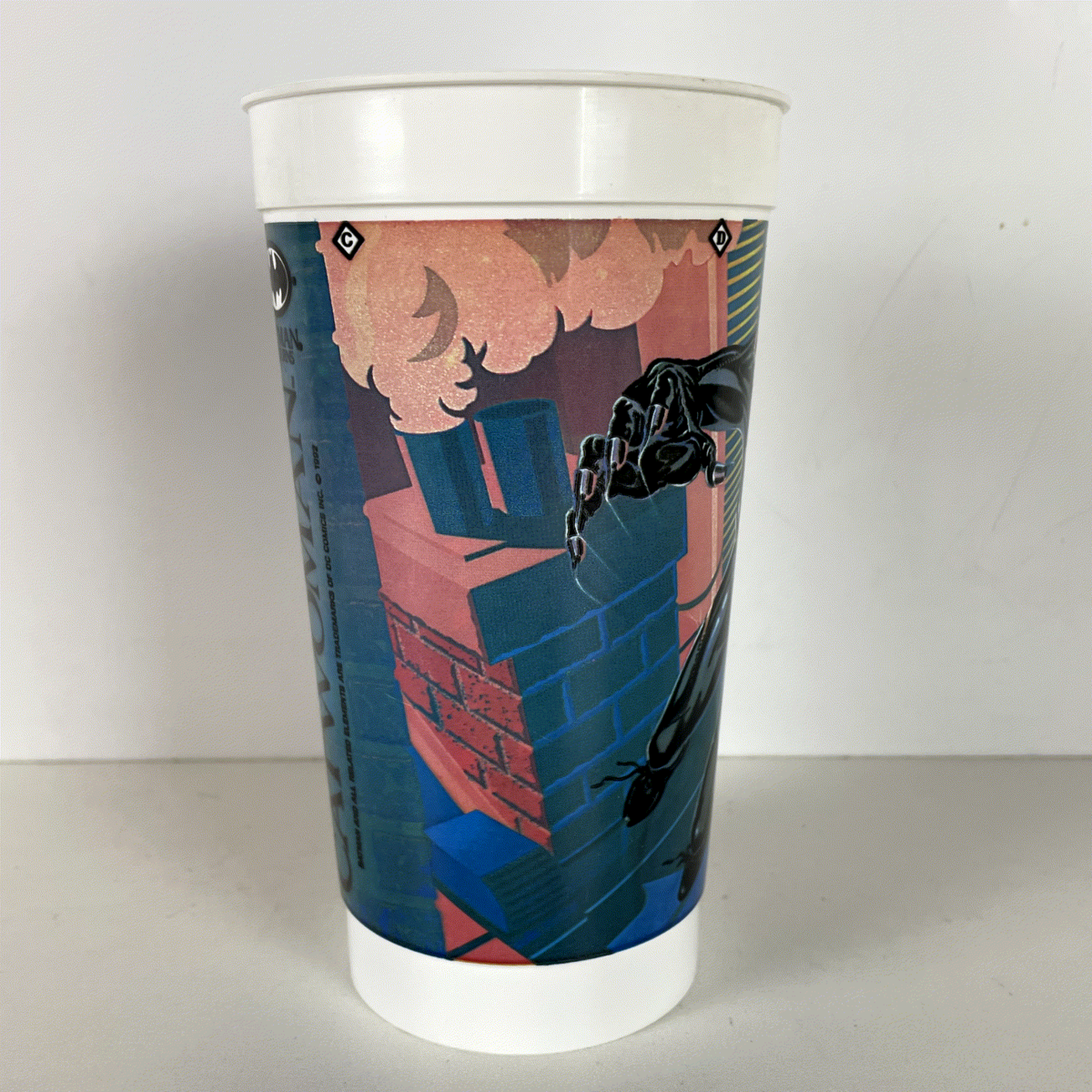 This piece is a fantastic relic of 90s cinema and fast-food marketing. The bottom of the cup is marked "The Collectibles" and "MADE IN CANADA," along with the HDPE recycling symbol and a product code "82-950." The cup measures approximately 7 inches tall. It's a must-have for collectors of Batman Returns memorabilia, DC Comics items, Catwoman collectibles, or vintage McDonald's and Coca-Cola advertising promotions. Celebrate the enduring legacy of this cinematic masterpiece and its unforgettable characters with this authentic piece of movie and fast-food history.