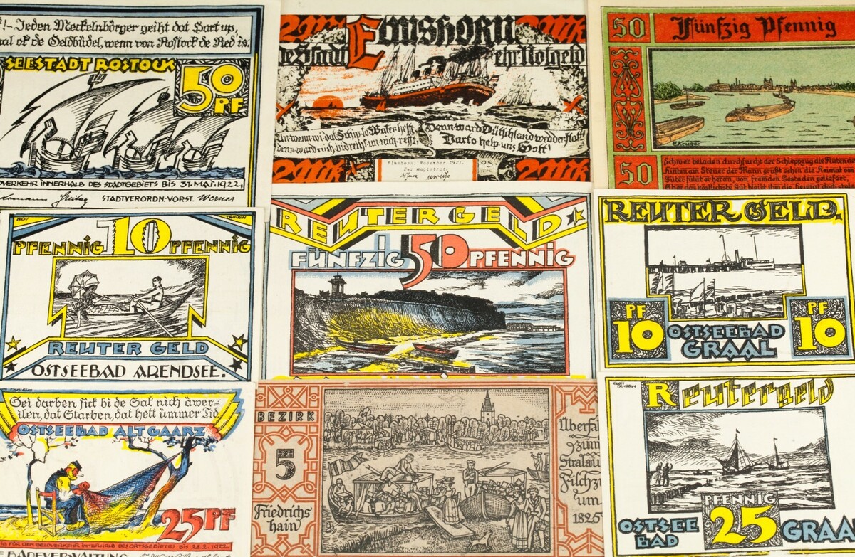 This lot will include 25 individual notgeld notes from Germany after World War I. All will be in Extra Fine to Uncirculated (XF-UNC) condition. Face values between 5 pfennig to 5 mark. Nautical theme; ships and boats.