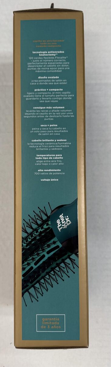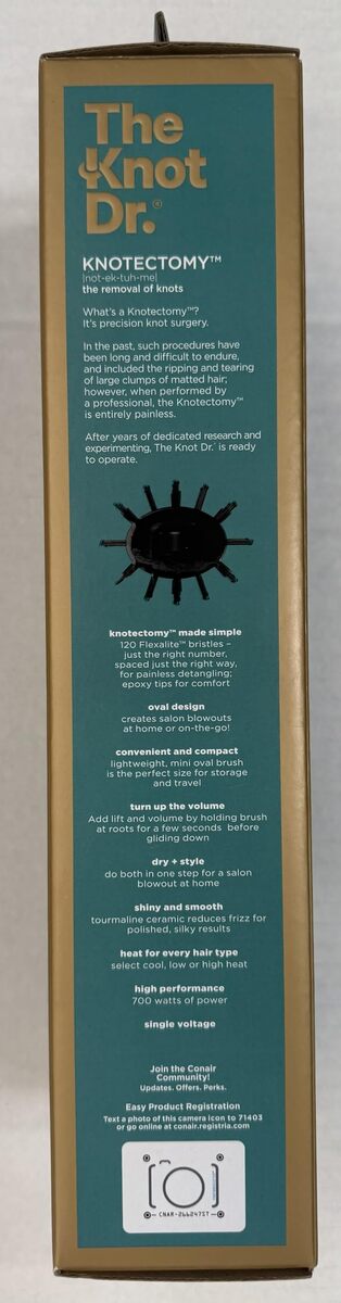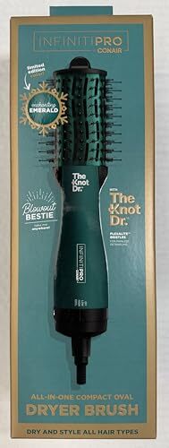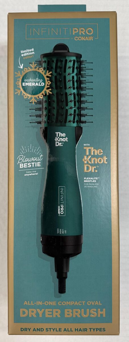 Product description: Transform your hair styling routine with this innovative all-in-one compact oval dryer brush in enchanting emerald. The Knot Dr. technology features 120 Flexalite bristles perfectly spaced for painless detangling and smooth styling. This powerful 700-watt tool combines drying and styling in one step, creating salon-quality blowouts at home or on-the-go. The oval design helps add lift and volume - simply hold at the roots briefly before gliding down. Its lightweight, travel-friendly size makes it perfect for storage and travel while still delivering professional results. The tourmaline ceramic technology helps reduce frizz for sleek, shiny results. With multiple heat settings suitable for all hair types and a compact design that creates beautiful styles anywhere, this limited edition emerald dryer brush is your new styling essential. The ergonomic design and perfectly spaced bristles work together to detangle and style with maximum comfort and minimum effort.