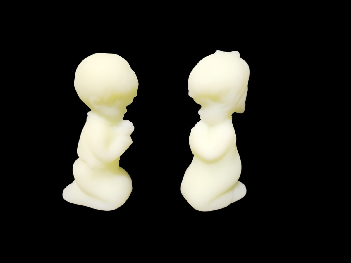 This vintage Fenton Art Glass set features the #5100 Praying Children figurines, done in the sought-after lime sherbet satin custard uranium glass. The set includes both the praying boy and girl, each with a soft satin finish that gives the glass a smooth, glowing appearance.