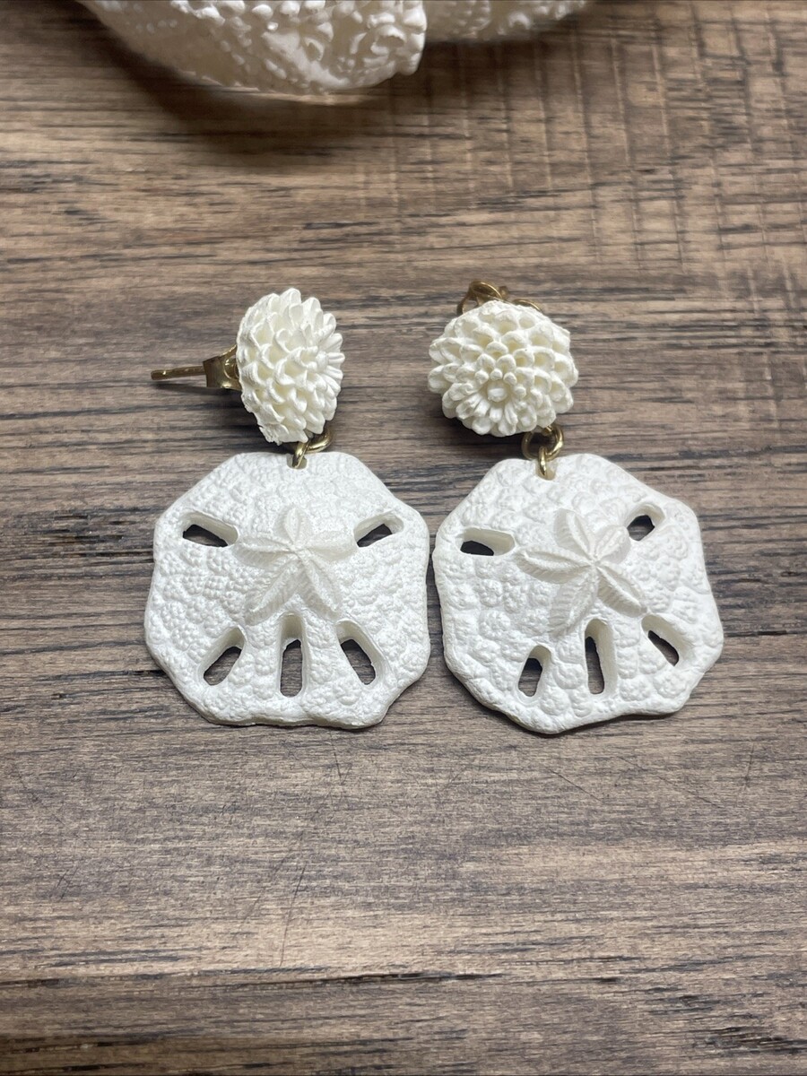 Vintage White Sand Dollar Plastic Bracelet Dangle Drop Earring Set Estate KG JD