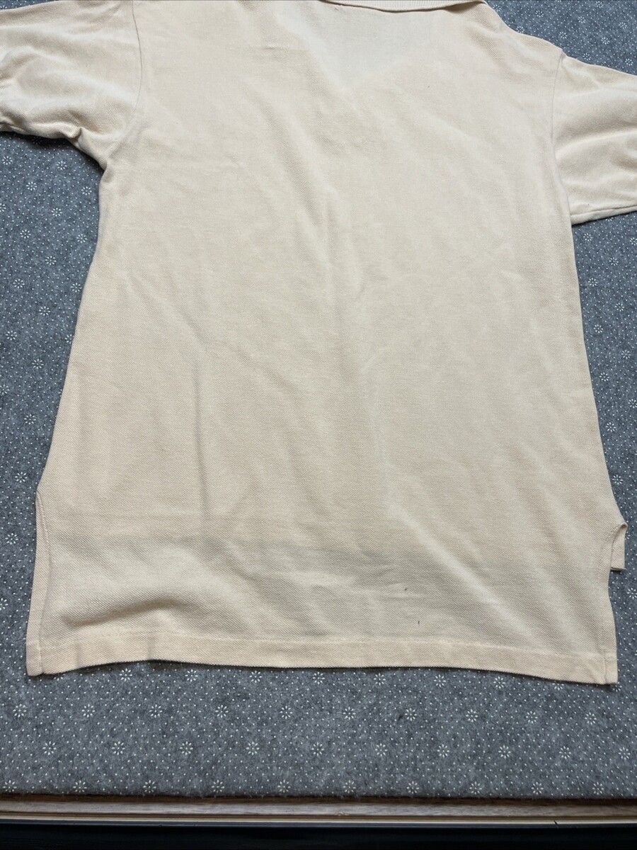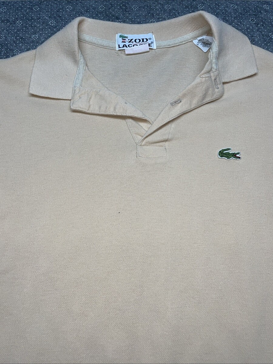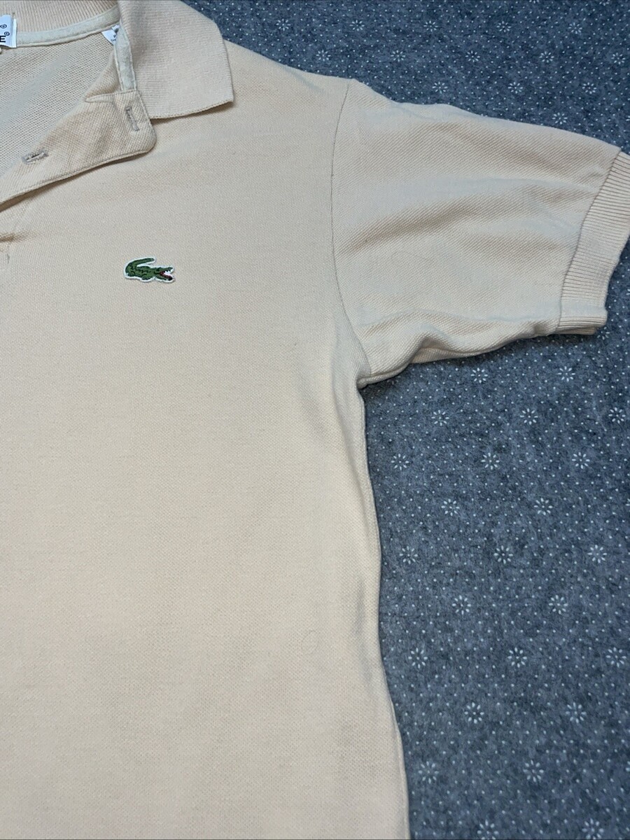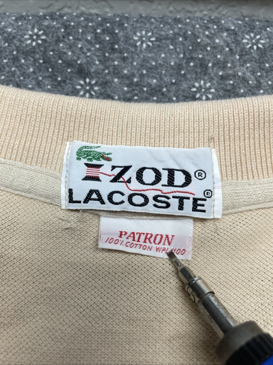 Lot of 2 IZOD Lacoste Polo Shirts. The tan shirt is in Good, wearable condition, with no rips, stains, or tears. The striped shirt has a small tear in the hem of the sleeve. Should be easily repairable. Also has a stain on the back - may come out in the wash.