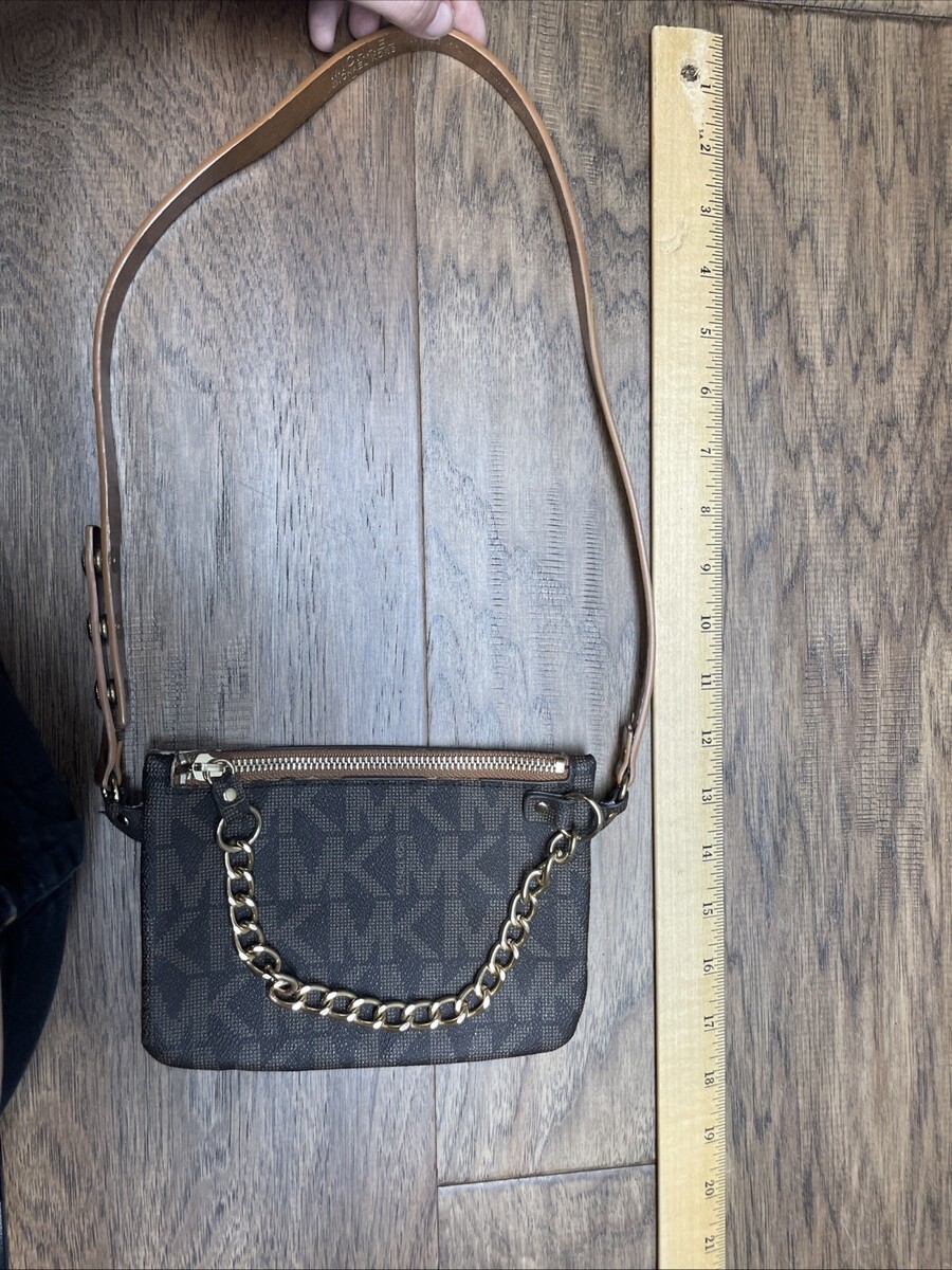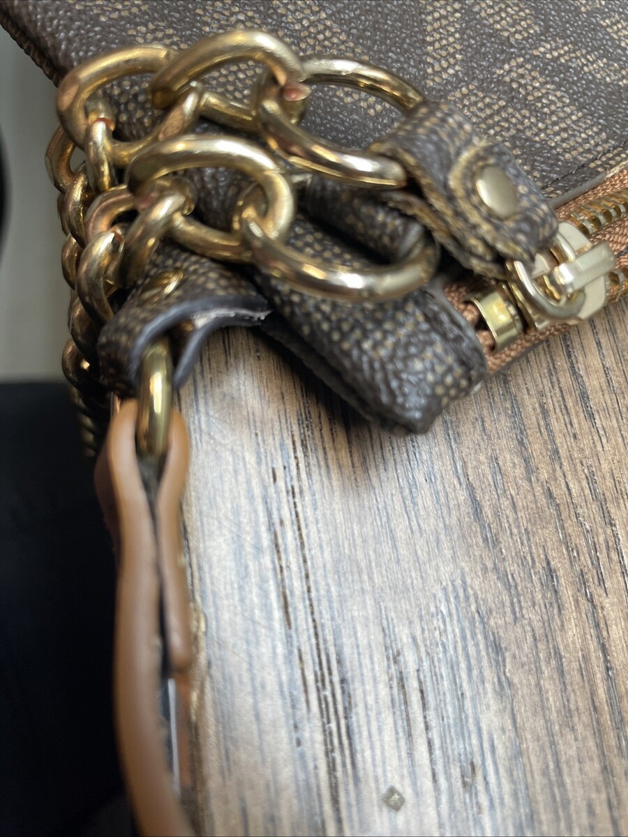 The Michael Kors Handbag Style#554131 is a stylish and versatile shoulder bag made of synthetic leather with a pebbled finish. It features a rectangular shape with a small size, ideal for casual occasions. The bag comes with a brown leather shoulder strap with a 12-inch drop and gold-plated hardware accents. The exterior color is brown with the brand's logo pattern, and it includes a chain zipper closure, foldover snap closure, and a detachable strap. The interior lining is made of faux leather with a golden color, adding a touch of luxury to this designer handbag. Light wear and tear from years of use. No peeling but crinkling of inside and the lining has come off in some places near the zipper.