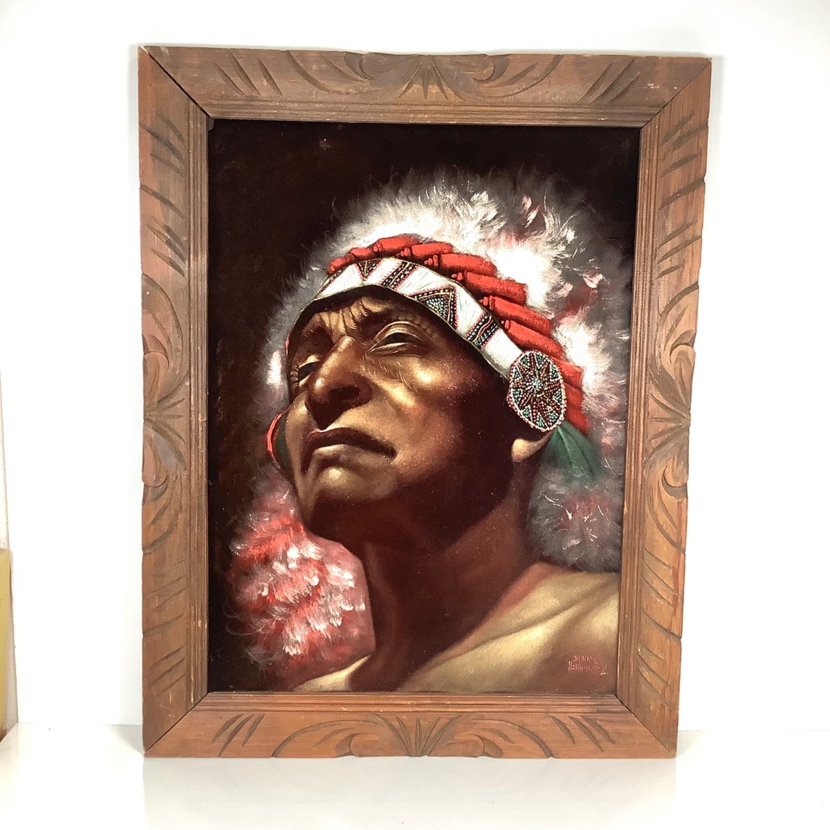 Large Native American Chief Black Velvet Portrait Painting Framed Vtg Signed Daniel Hernandez. Good overall condition. Original frame (which measures approximately 21.75 inches wide by 27.75 inches high) does show some wear including some light nicks or scuffs but overall good condition also. Please see all photos.