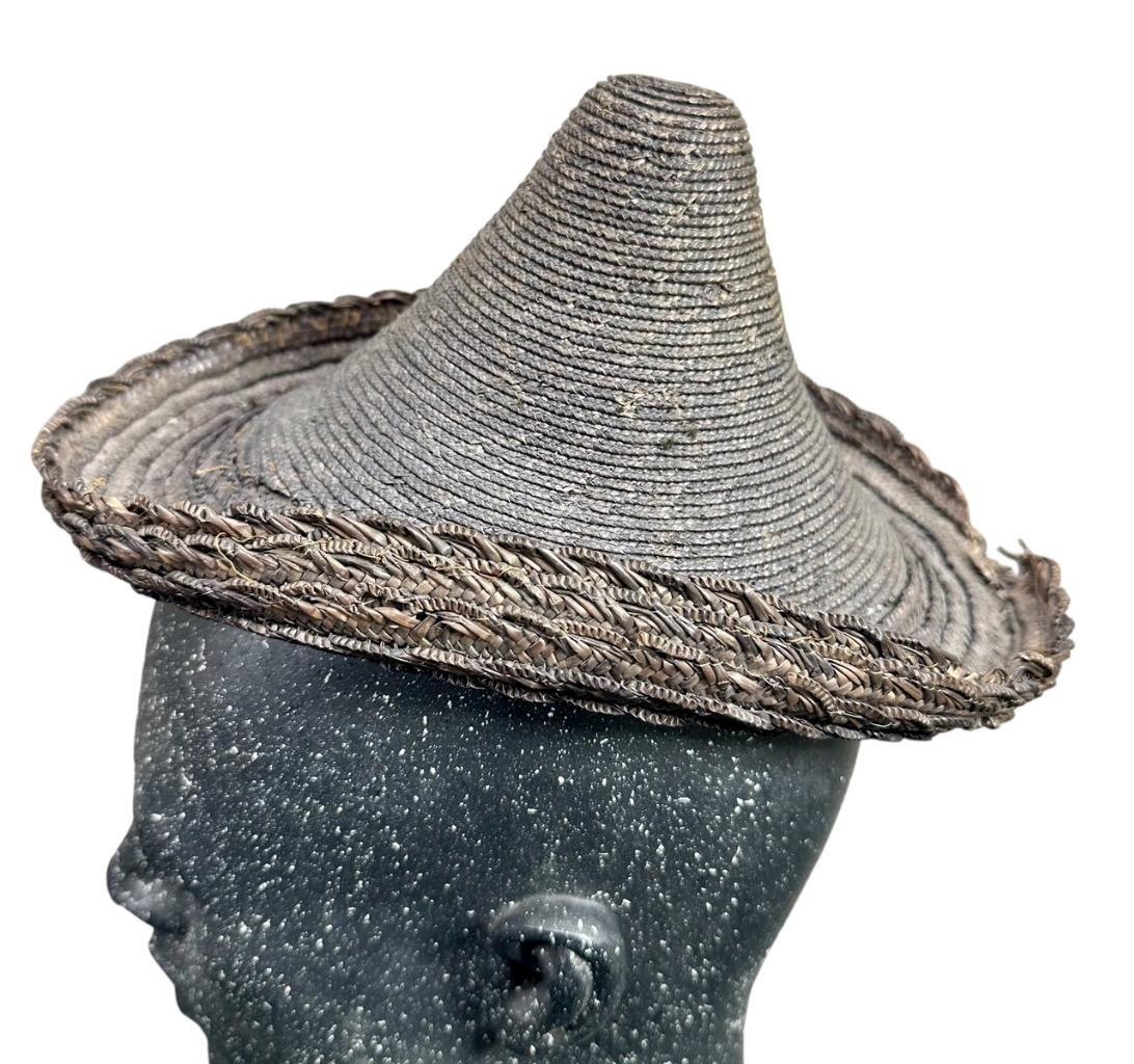 Antique Tyrolean Style Hat of Black Straw Circa 1885 Previously owned and remains in good condition for its age with some damage in the back Comes as shown