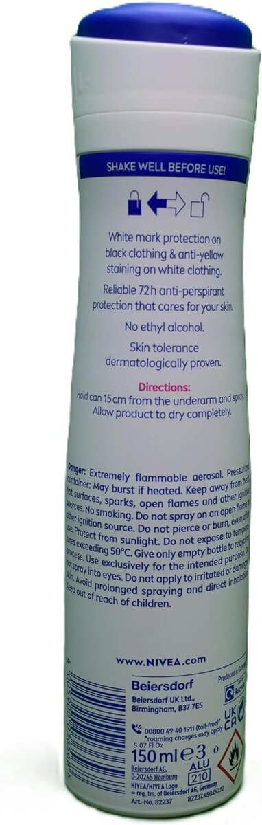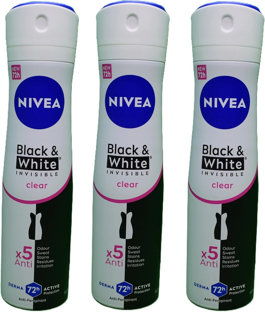Nivea for Women Anti-Perspirant Spray delivers 48-hour protection against sweat and odor while being gentle on skin. The Invisible formula leaves no white marks on black or white clothing, making it perfect for any outfit. This pack includes 3 x 150ml bottles for long-lasting supply. Dermatologist-tested and designed specifically for women's needs, this antiperspirant provides reliable protection throughout the day while keeping underarms dry and comfortable.