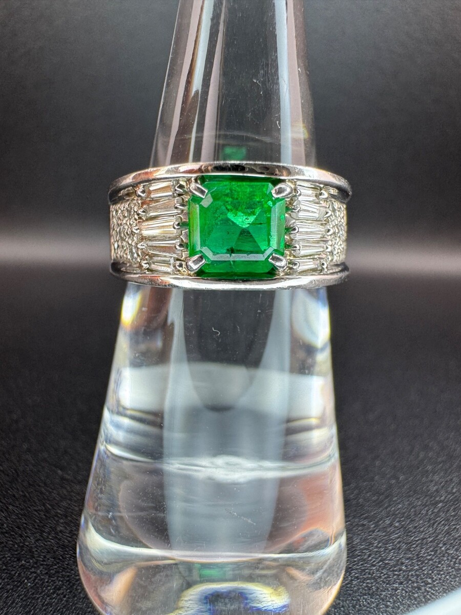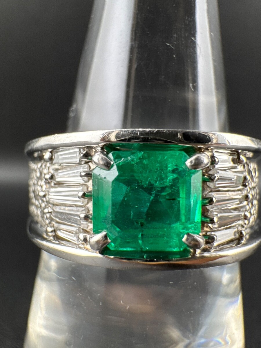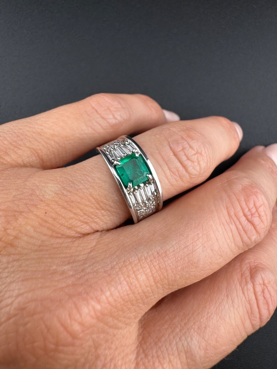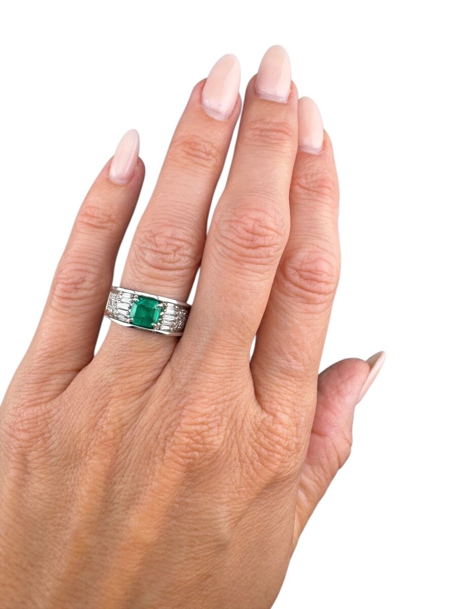 Custom-made platinum ring featuring a central emerald set within a low-profile design. Twenty-one (21) round brilliant cut and baguette cut earth mined diamonds are prong and pave set along the shoulders. The mounting is solid and well-constructed, consistent with fine jewelry fabrication standards.