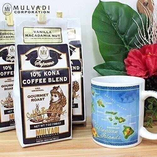 Experience the rich smoothness of Mulvadi's 10% Kona Coffee Blend. Infused with the delightful flavor of chocolate macadamia nut, this coffee delivers a perfect balance of sweetness and nuttiness in every sip. Proudly representing Hawaii, Mulvadi brings you a taste of Aloha with every brew?crafted for coffee lovers who appreciate quality and flavor.