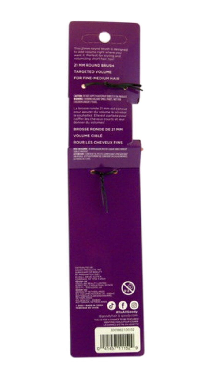 The Goody style boost 21 mm round hair brush is the perfect tool for adding volume right where you want it. Offers a comfortable handle and is designed with fine flexible ball tipped bristles for styling and volumizing shorter hair styles. Use on wet or dry hair. Great for fine to medium hair types.