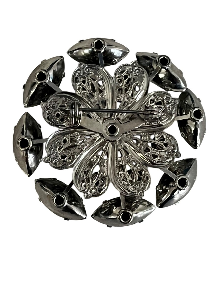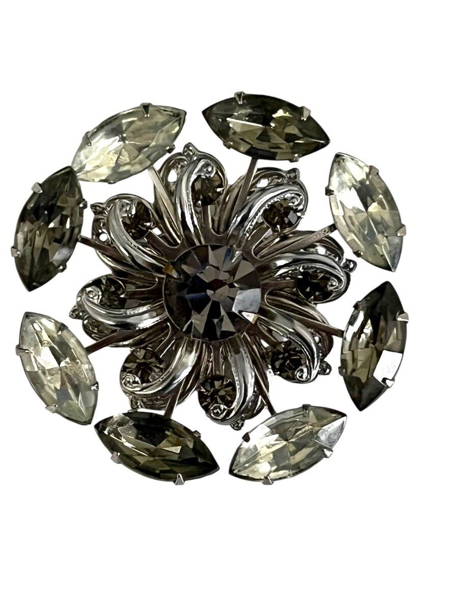 Striking vintage floral brooch featuring a dimensional silver-tone setting with layered petal detailing and smoky gray rhinestones. The design centers around a faceted round stone, surrounded by marquise (navette) cut crystals that give it a dramatic, mid-century statement look. A beautiful piece for collectors or to elevate any outfit.