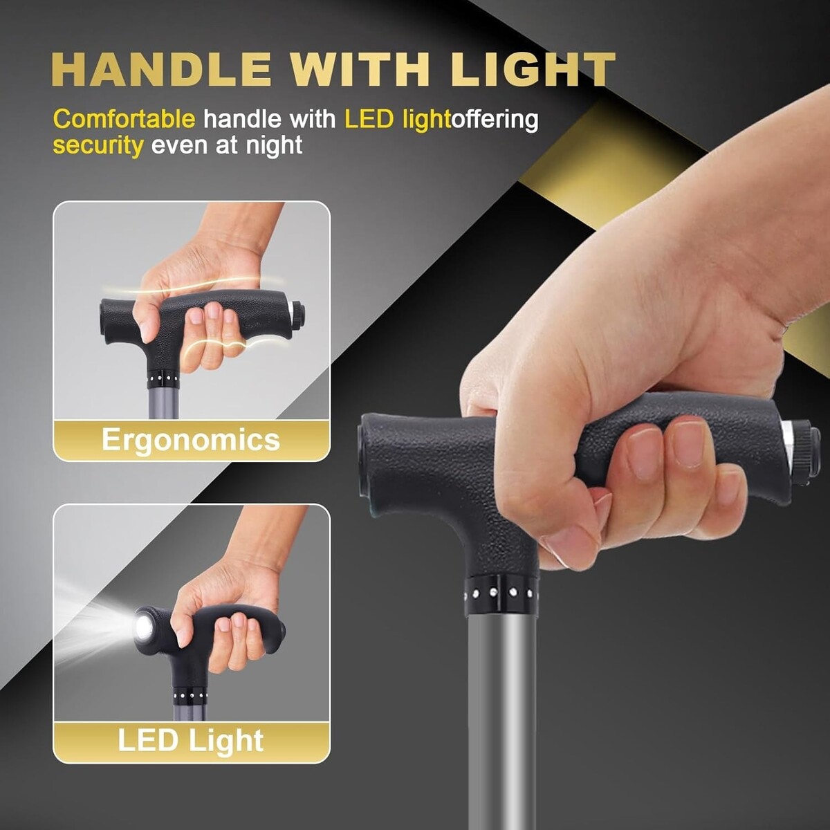 Features: Adjustable Height,LED Light,Folding,Cane with Seat,Ergonomic Handle,Anti-Slip Tip