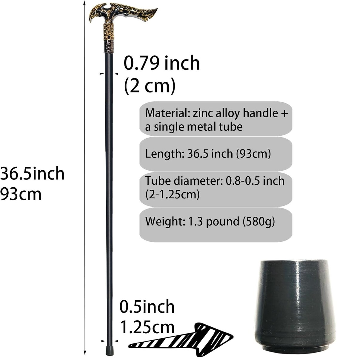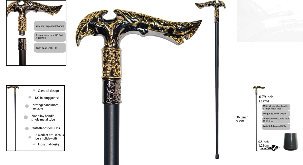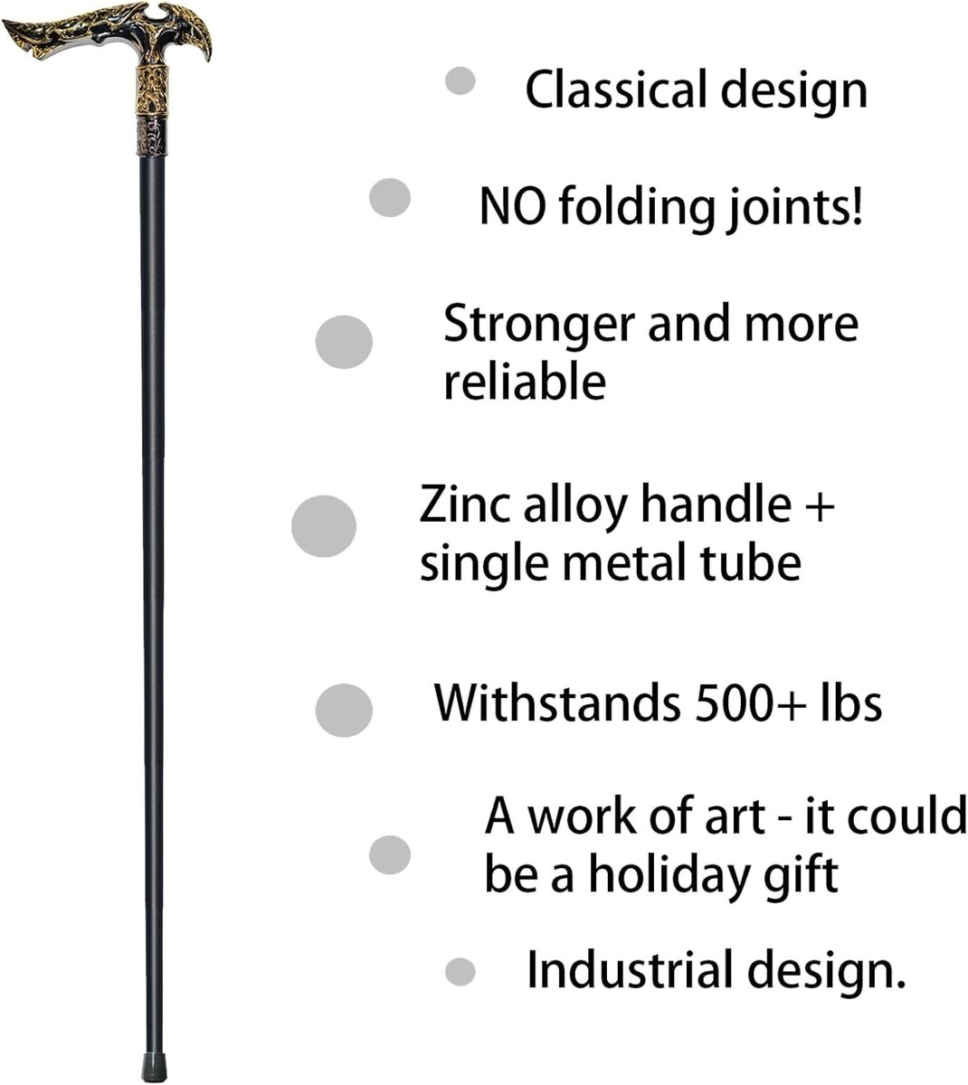Features: Ergonomic,Unbreakable Stability,Designed for discerning users,All-metal construction,Solid zinc alloy handle,Withstand 500+ lbs,Zero wobble,No rust,No creaks,No loose parts,Engineered for Comfort,Reduces wrist fatigue,Ideal for daily walks,Arthritis relief,Timeless Elegance,Matte black shaft,Intricate patterned handle,Sophisticated accessory,Blends with suits,Blends with casual outfits,Non-slip rubber tip,Universal fit,Gender-neutral design