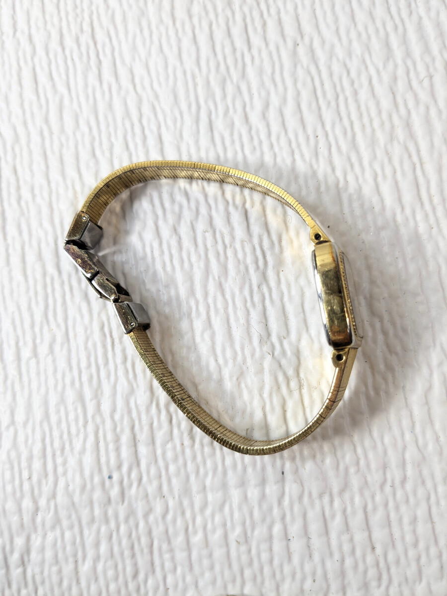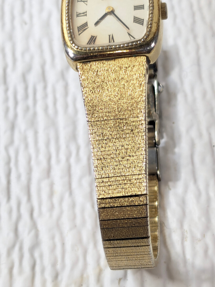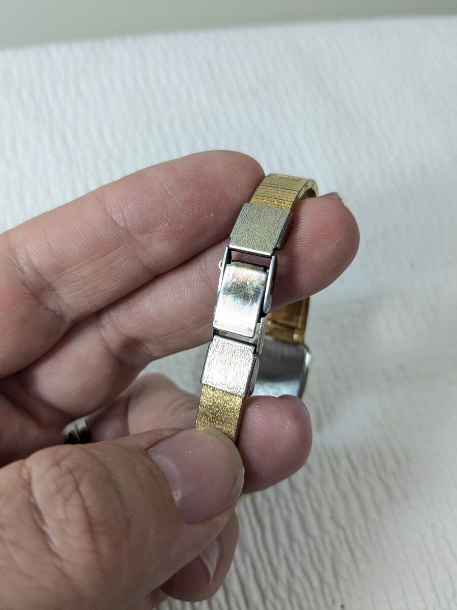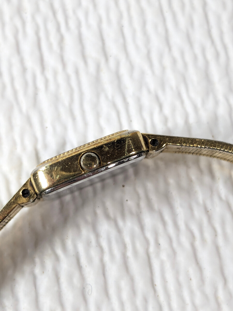 Some wear/patina/spots where the gold finish has rubbed, from use as shown. Needs a new battery. See pics for details.