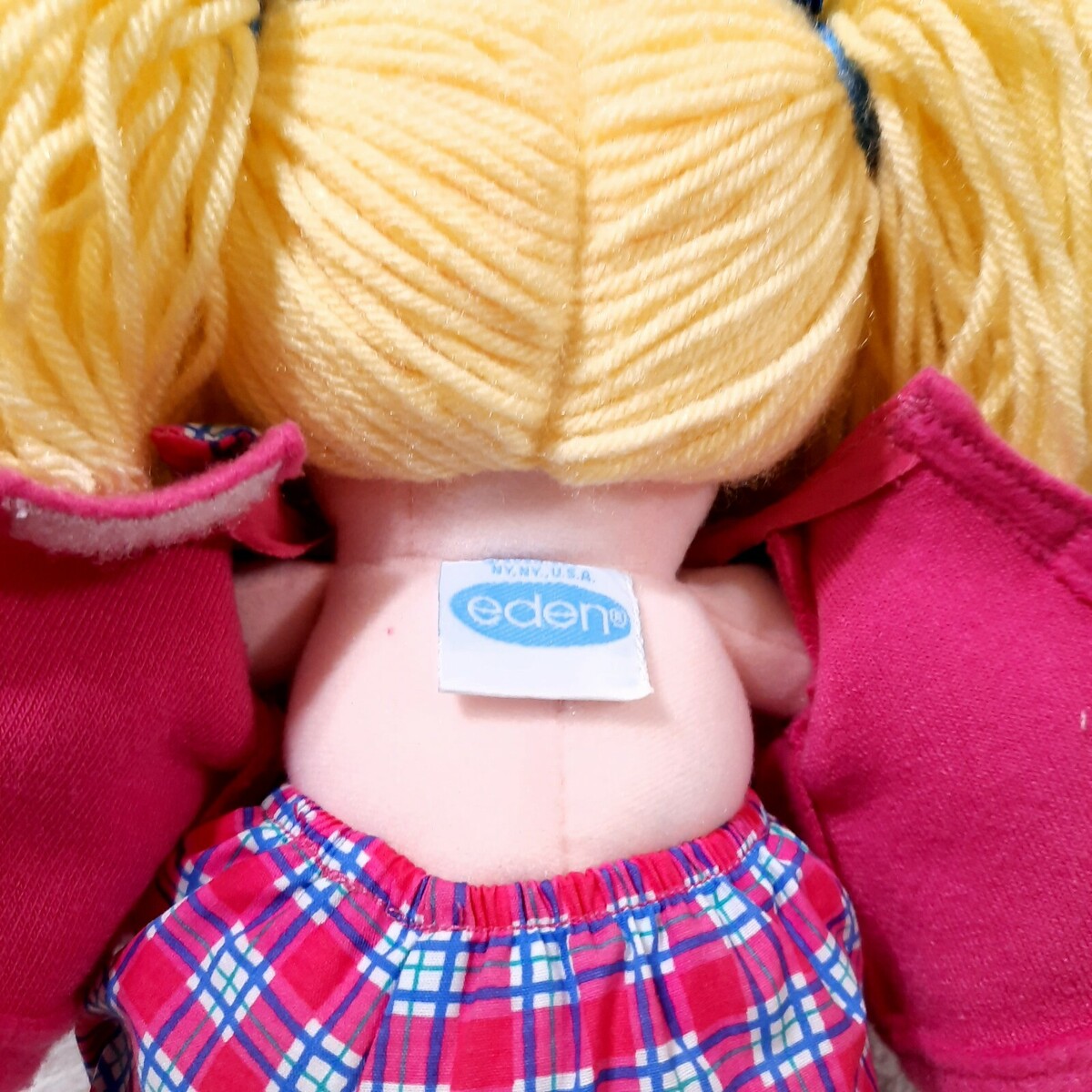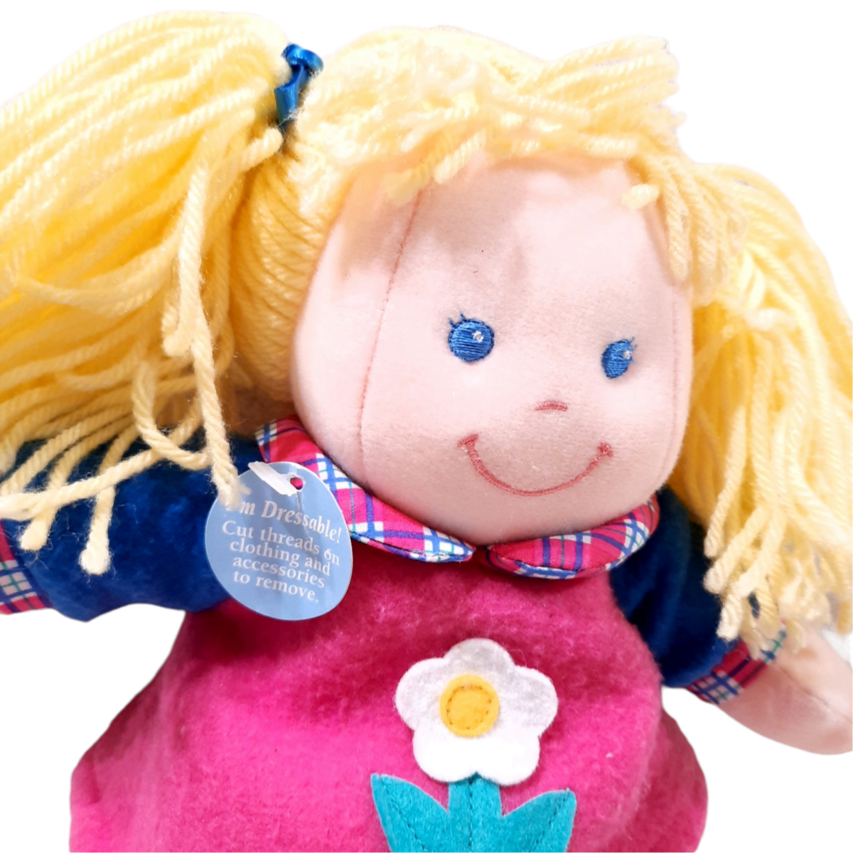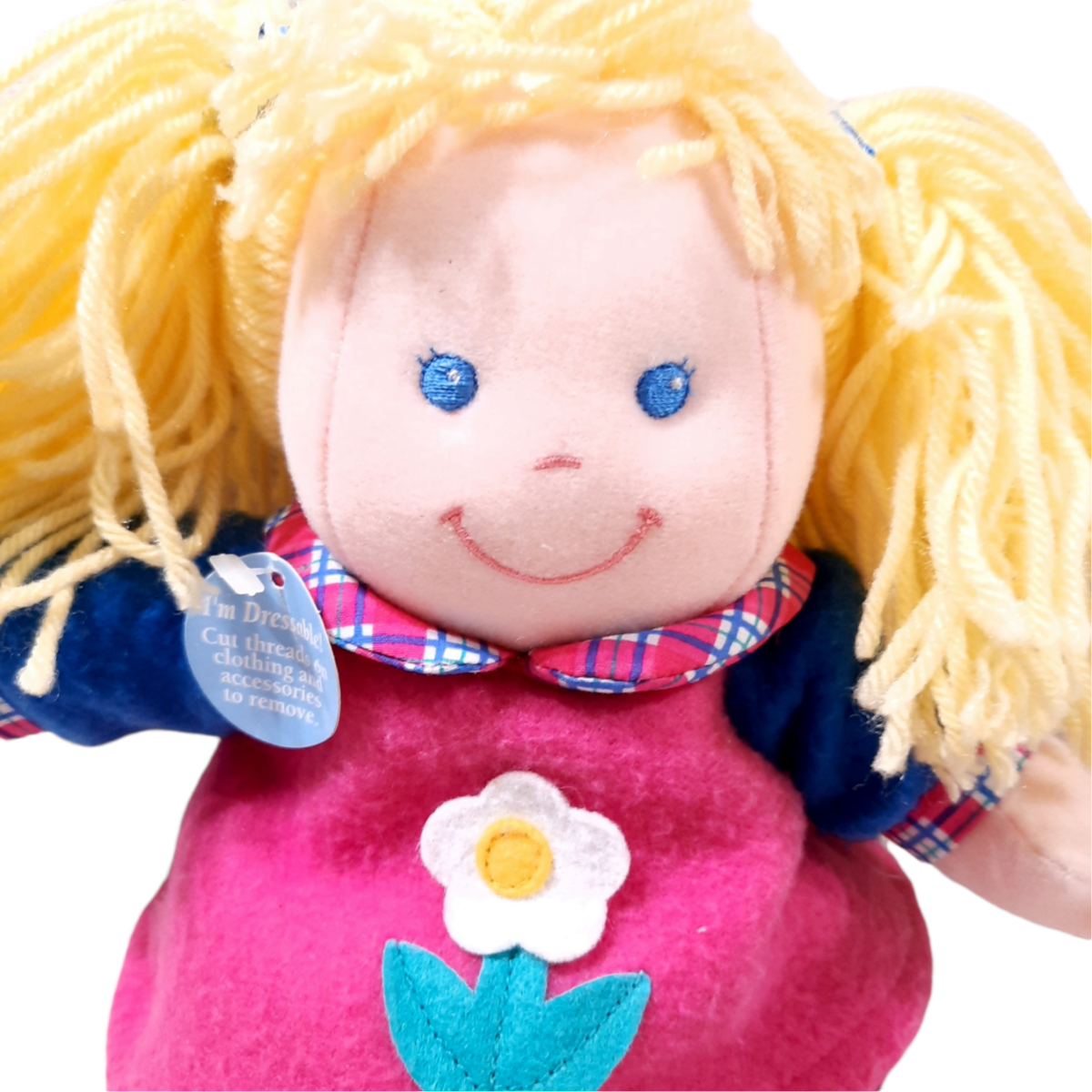 New doll, has hang tag on collar only. Probably from the 1990s. Blonde yarn hair doll with pink fleece top with white daisy. Pink and blue plaid pants. Yellow felt shoes. Dressable learning doll.