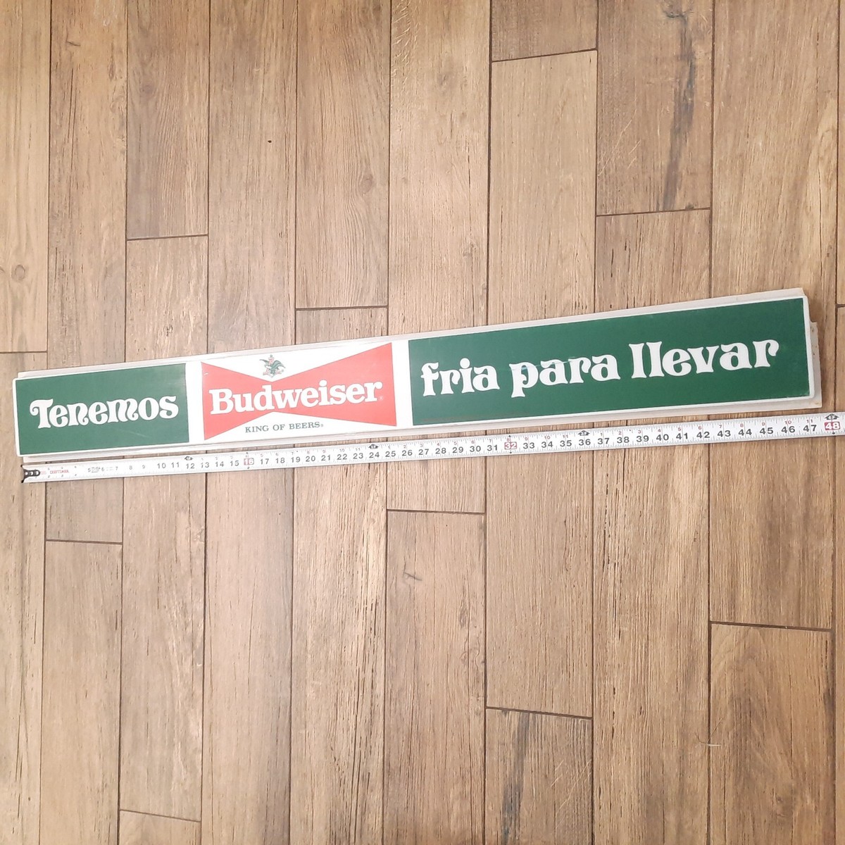 Plastic sign insert from a light. Does NOT include light or light box. As as is. Some cracking/missing edge as shown. Wear/scratches/marks as shown. See pics. Lightweight plastic. Says WE HAVE COLD BUDWEISER TO GO in Spanish.