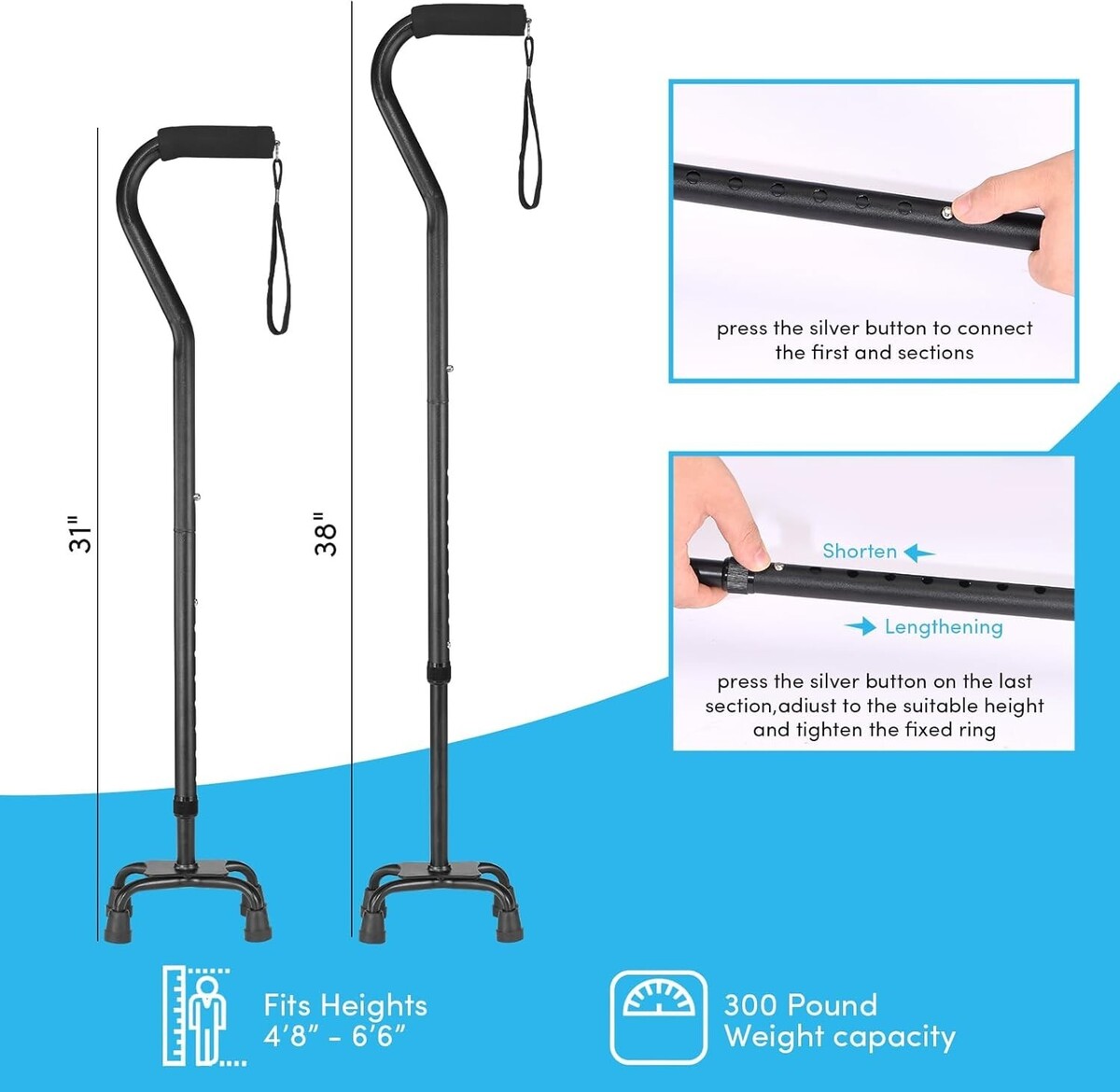 Adjustable Height: Customize your walking cane?s height with a range from 31 to 38 inches, offering a perfect fit for both men and women.