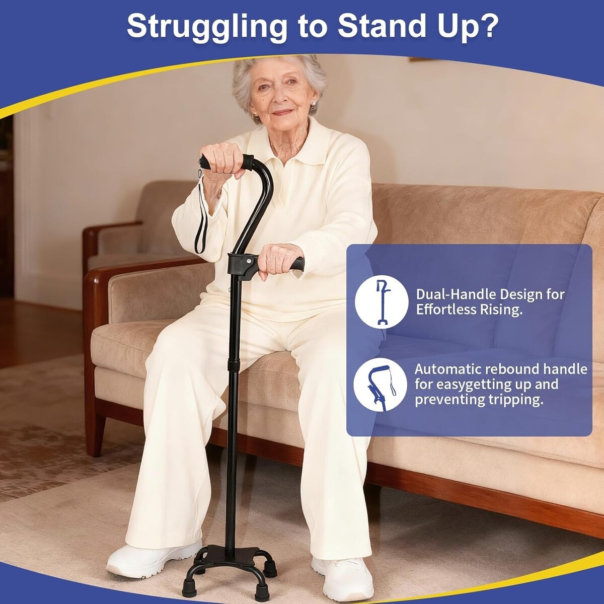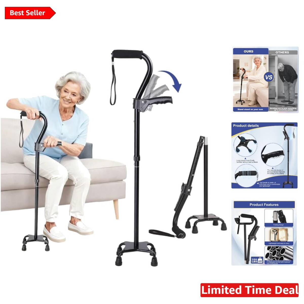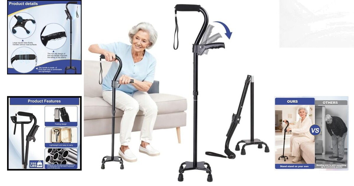 Stable 4-Pronged Quad Base: Widened, non-slip quad base prevents tipping and enhances stability, accommodating up to 350 lbs.