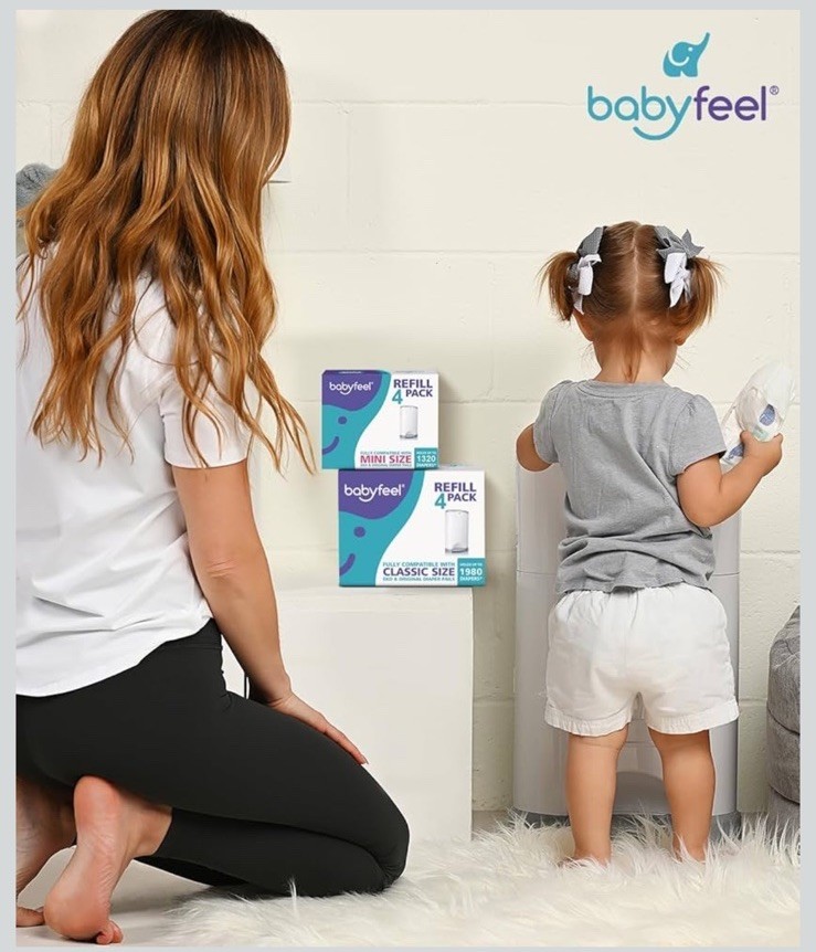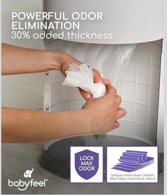 The Babyfeel Refills for DEKOR PLUS Diaper Pails in 8 pack features odor-neutralizing and extra-durable plastic bags designed specifically for baby waste. With a capacity of 42.95 pounds, these transparent bags come in a convenient pack of 8 and are made with a fresh powder scent for added comfort. The Babyfeel brand is known for its quality products, and this refill pack is no exception, making it a practical and efficient solution for managing diaper disposal. Made in Korea, Republic of, these bags are a reliable choice for parents looking for a dependable diaper pail refill option.