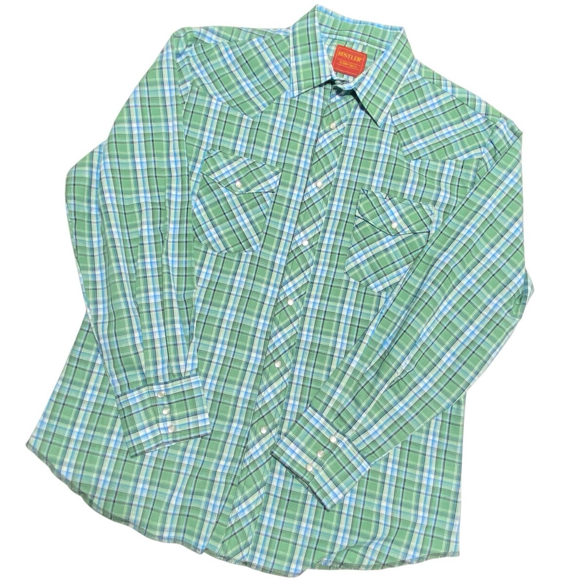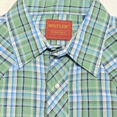 Vintage RUSTLER Green Blue L Plaid X-Long Tails L/S Pearl Snap Shirt POLY COTTON
