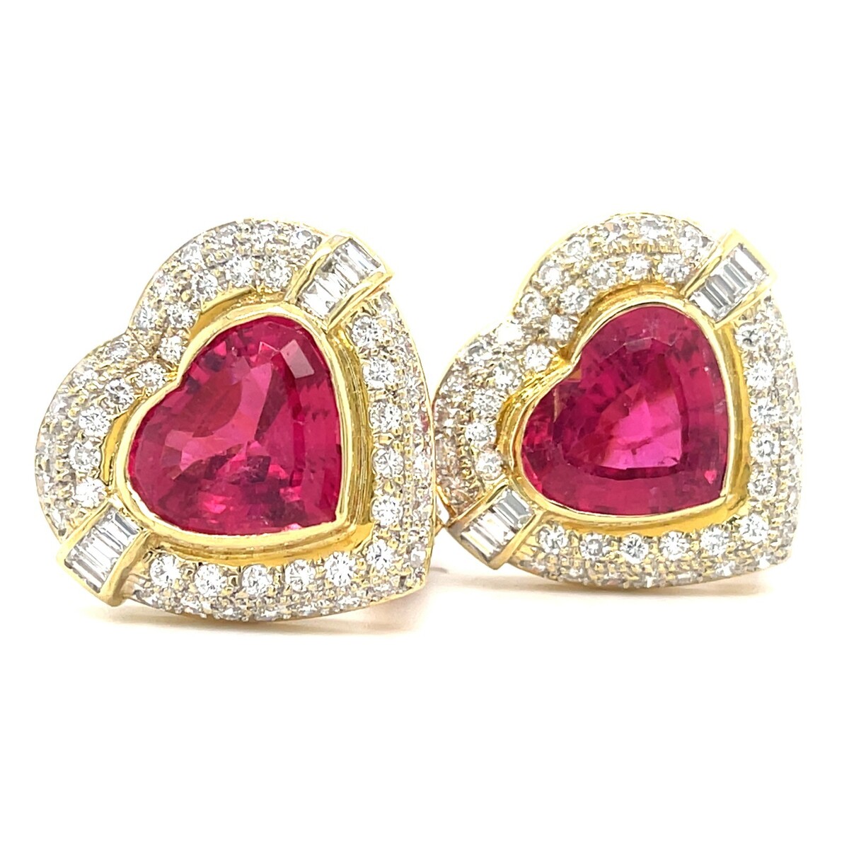 18k Yellow Gold Heart-shaped 13.45ct Rubellite, 2.25ct Diamond Earring Clips 23g