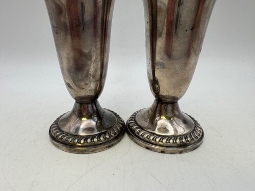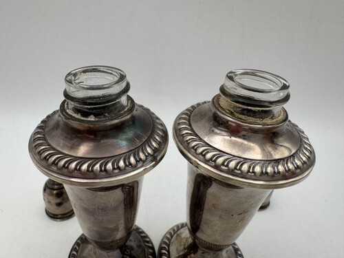 These salt pepper shakers measure 5" in height and are in good estate condition with some tarnish and small dings. They are weighted and have glass liners.