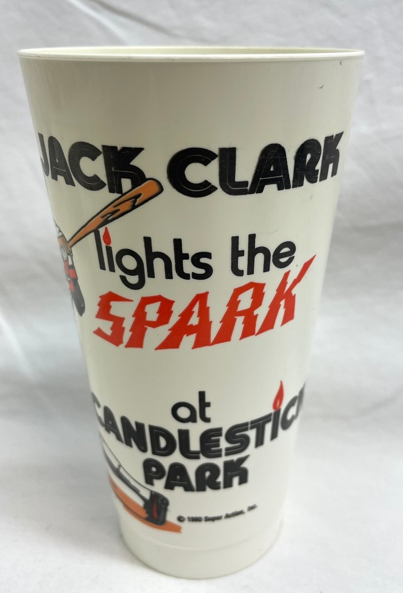 This is a Vintage 1980 JACK CLARK #22 San Francisco Giants "Jack Clark Lights the Spark at Candlestick Park" MLB Baseball Plastic Slush Puppie Plastic Cup COLLECTOR'S CUP. It is 5 3/4 inches tall. It is in Great Condition. It is CLEAN! No Cracks or chips. Made by Super Action Inc. Would make a nice display piece. Combine auctions to save on shipping. Please contact me if you need to make other payment arrangements. EAGD2