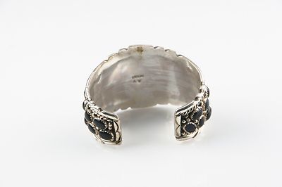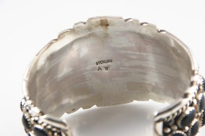 This beautifully detailed bracelet contains 42 pieces of onyx and weighs 81.6 grams. It is 2 inches at the widest point and is 5 7/8 inches around with a 1 1/4 inch gap (fits around 7 inch wrist). This is a fantastic piece that is in great condition. It is signed Sterling A W. It could possibly Antia Whitegoat or Annie Willie by the intials and style but we are not 100% sure.