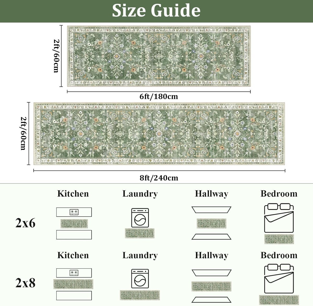 This 2x8 runner rug is an exquisite addition for various indoor areas, complementing your hallway, entrance, kitchen, or laundry room with vintage charm and practicality.
